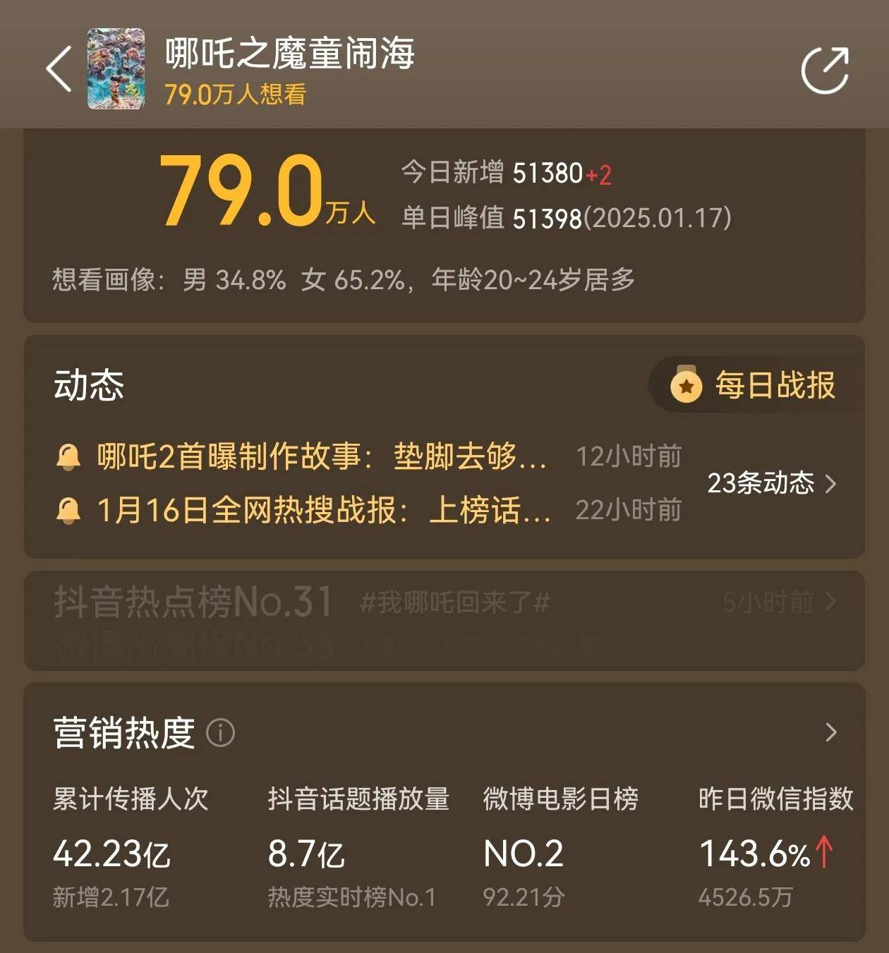 目前,《哪吒之魔童闹海》想看人数已经突破79万,相当高,而且累计传播人次已经突破42亿次,预售票房已破3000万,话题播放量达到8亿多,这是一个很恐怖的数据,这是其他电影无法企及的高度,所以说《哪吒之魔童闹海》成为王者的可能性不小。