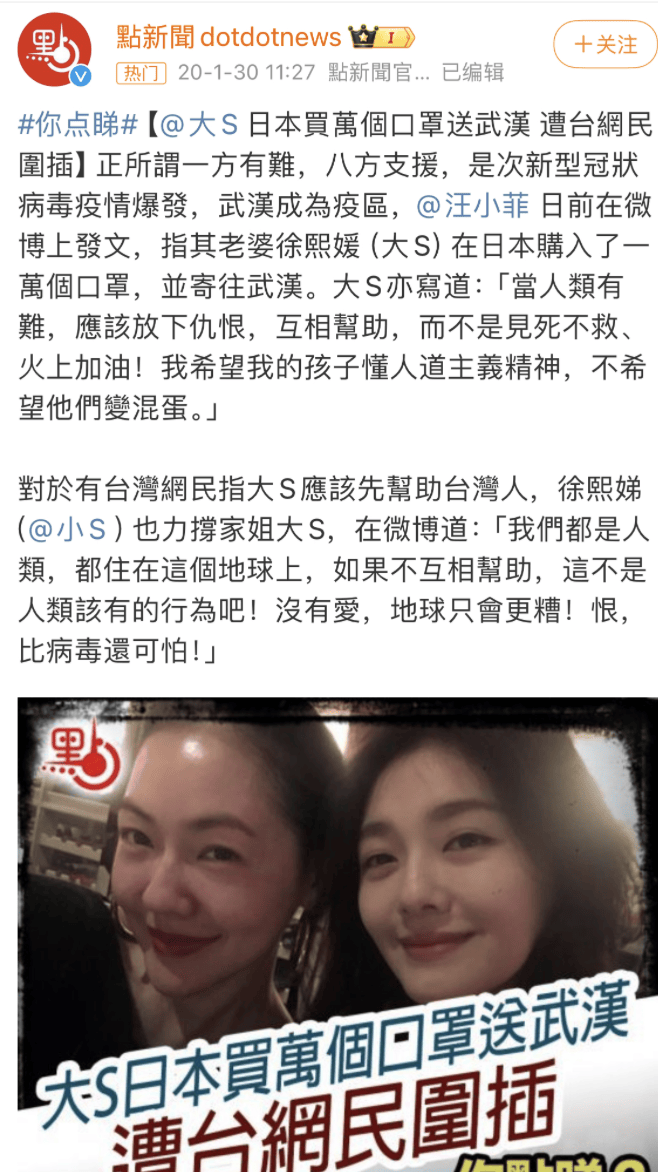 甚至还冒着被台湾网民警告的风险,给我们捐过口罩。