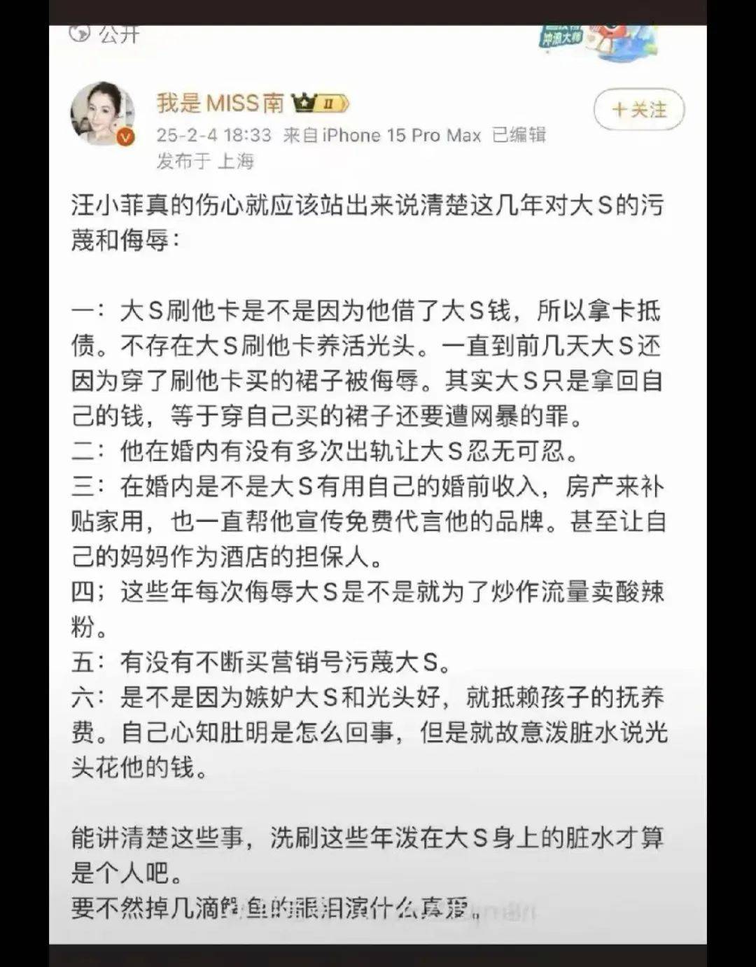 关于大S的坏话,不是都是你说出来的吗?诬陷她tai独、吸D、出轨、刷自己的卡养光头。