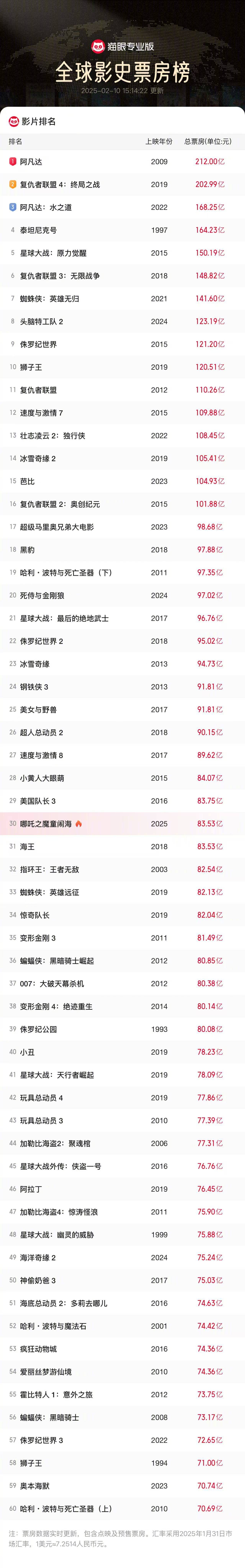 搜狐娱乐讯 据猫眼专业版数据,《哪吒之魔童闹海》累计票房(含预售)超83.53亿,超《海王》票房成绩,进入全球影史票房榜前30名,也是票房TOP30影片唯一非好莱坞影片。