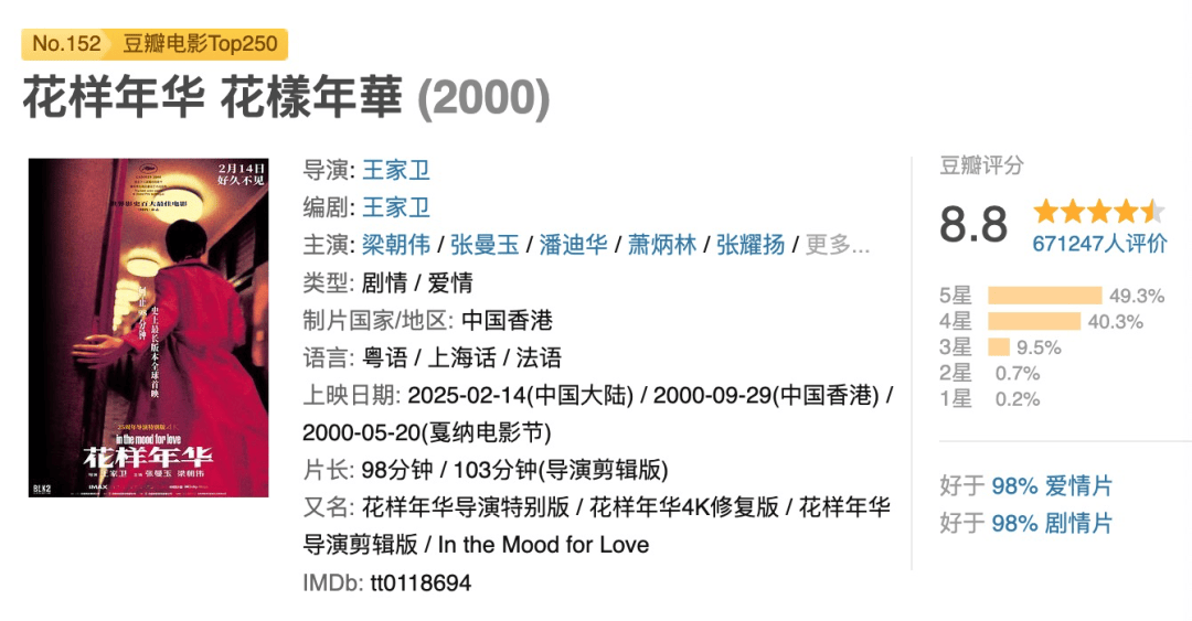 如果说瞄准情人节档期上映的片子,倒应该是这一部,那就是王家卫导演的经典爱情片《花样年华》。