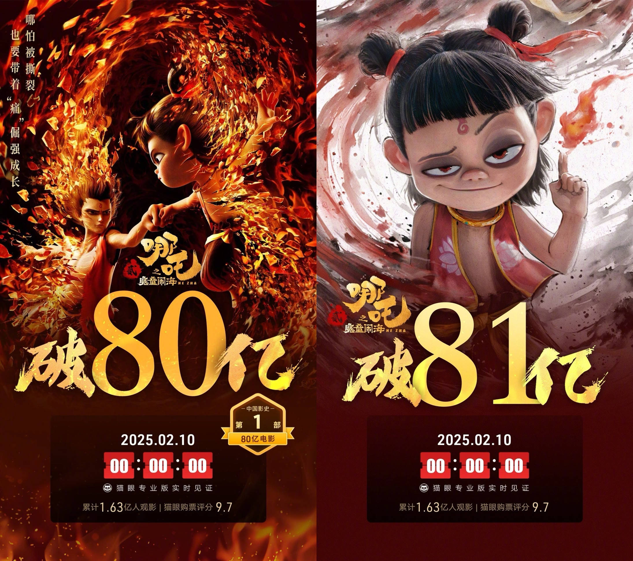 搜狐娱乐讯 据猫眼专业版数据,截至2月10日00:00,《哪吒之魔童闹海》上映第13天,累计票房连破80亿、81亿,成内地影史首部破80亿电影。