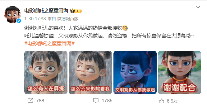 早前在国内也出现了不少盗版资源,作为《哪吒之魔童闹海》的出品方之一,北京光线影业有限公司在知识产权保护方面做得相当到位。在今年春节档电影上映前,#拒绝盗摄倡议#的话题就冲上了热搜榜单,各大社交平台上关于此话题的讨论声浪此起彼伏。1月30日,春节档的第二天,电影《哪吒之魔童闹海》官方微博发布温馨提醒:“文明观影从你我做起,请勿盗摄,把所有惊喜保留在大银幕呦。”