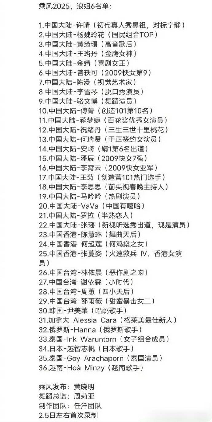 搜狐娱乐讯 2月9日,一张网传的《乘风破浪的姐姐》第六季录制名单出炉,包括何超莲、李思思、许晴、林依晨、金靖等人。