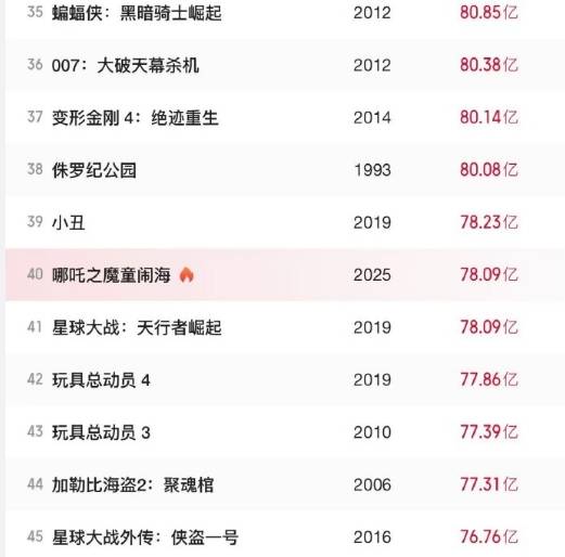 搜狐娱乐讯 2月9日,据猫眼专业版数据,《哪吒之魔童闹海》票房累计至78.09亿,超《星球大战:天行者崛起》票房成绩,进入全球票房榜前40名,同时它也成为了首部达此殊荣的亚洲电影,在全球动画电影的榜单上也攀升到了第七位。