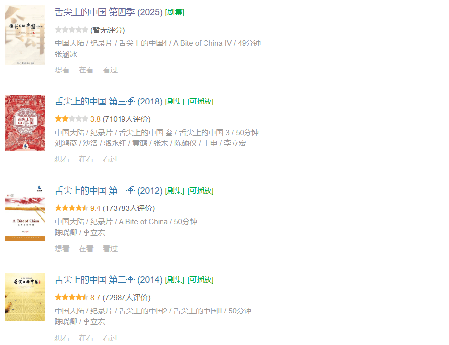 第一季在2012年开播后,2014年第二季已经与观众见面;而第三季开播则是2018年,间隔扩大到四年;再到第四季,间隔已经足足七年,值得一提的是,《舌尖4》在央视每年的节目片单上就已经出现了三年以上。
