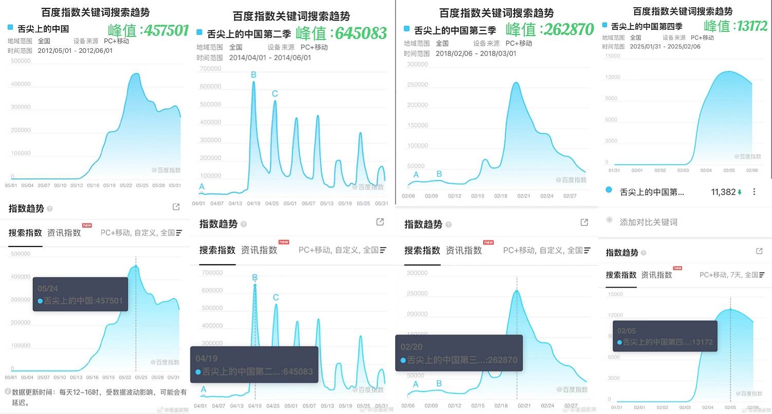 这或许可以作为一个视角,看待这个十多年前轰动一时、助力带动了此后纪录片市场尤其是美食纪录片整体发展的经典IP,在当下面对的处境——在春节重新回归,竟然几乎“无人在意”。