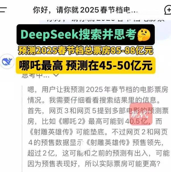 春节档大战之前,DeepSeek经过了13秒的深思熟虑,便断定票房冠军是《哪吒之魔童闹海》,票房将超过45亿。