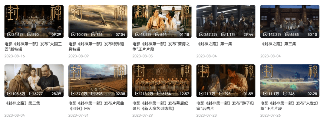 为此,官方推出了一系列特效场景展示视频,每个视频时长约1.5分钟,着重展现影片中震撼的战争场面和精美的神话场景,在B站平台的播放量总计超过800万次,影片的 “想看” 人数在预热期迅速增长至60万 。