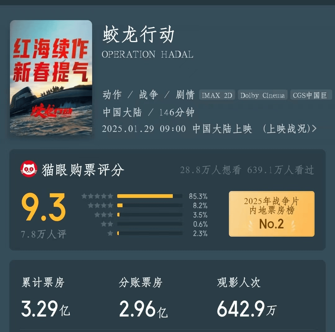 连城易脆认为,在陆续推出了《红海行动》《长津湖》等电影之后,博纳对主旋律影片路径依赖严重,加上《蛟龙行动》在内容上确实存在短板,在同期电影的衬托下格外明显。