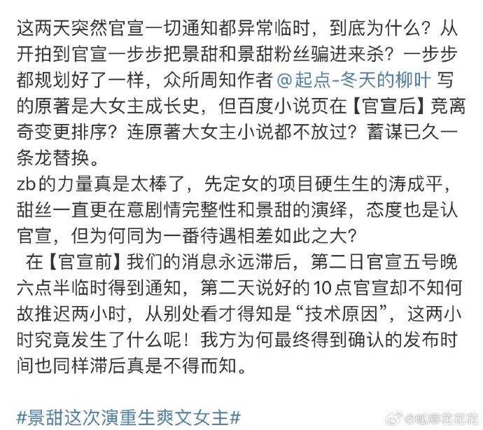 除此以外,景甜粉丝还翻出了两人拍摄电视剧的原著,力证原著就是大女主作品,是男主张晚意“抢”了景甜的番位。