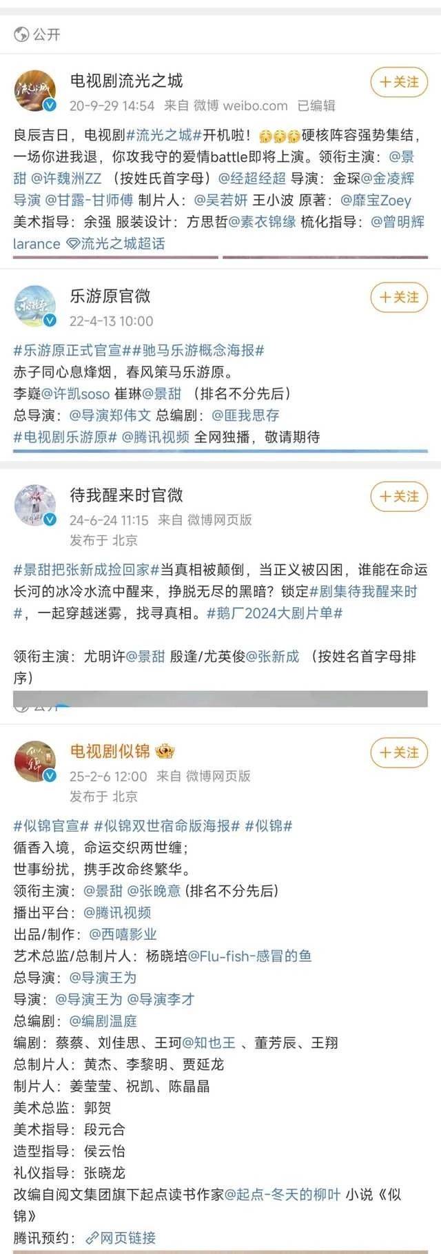 不查不知道,一查吓一跳,在粉丝的发文中,景甜已经有4部与男主角平番的电视剧了,而这四位男演员分别是:许魏洲,张新成,许凯,无一例外都是出道晚于她的后辈。