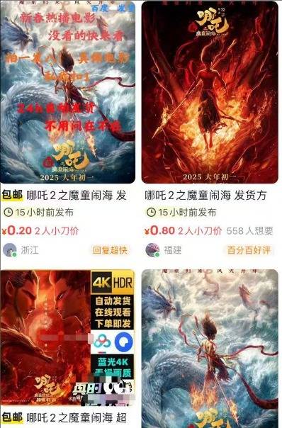 目前,在多个平台均发现网店兜售“枪版”《哪吒2》等影视资源售卖的链接,用户仅花1.9元即可获得影片下载资源。