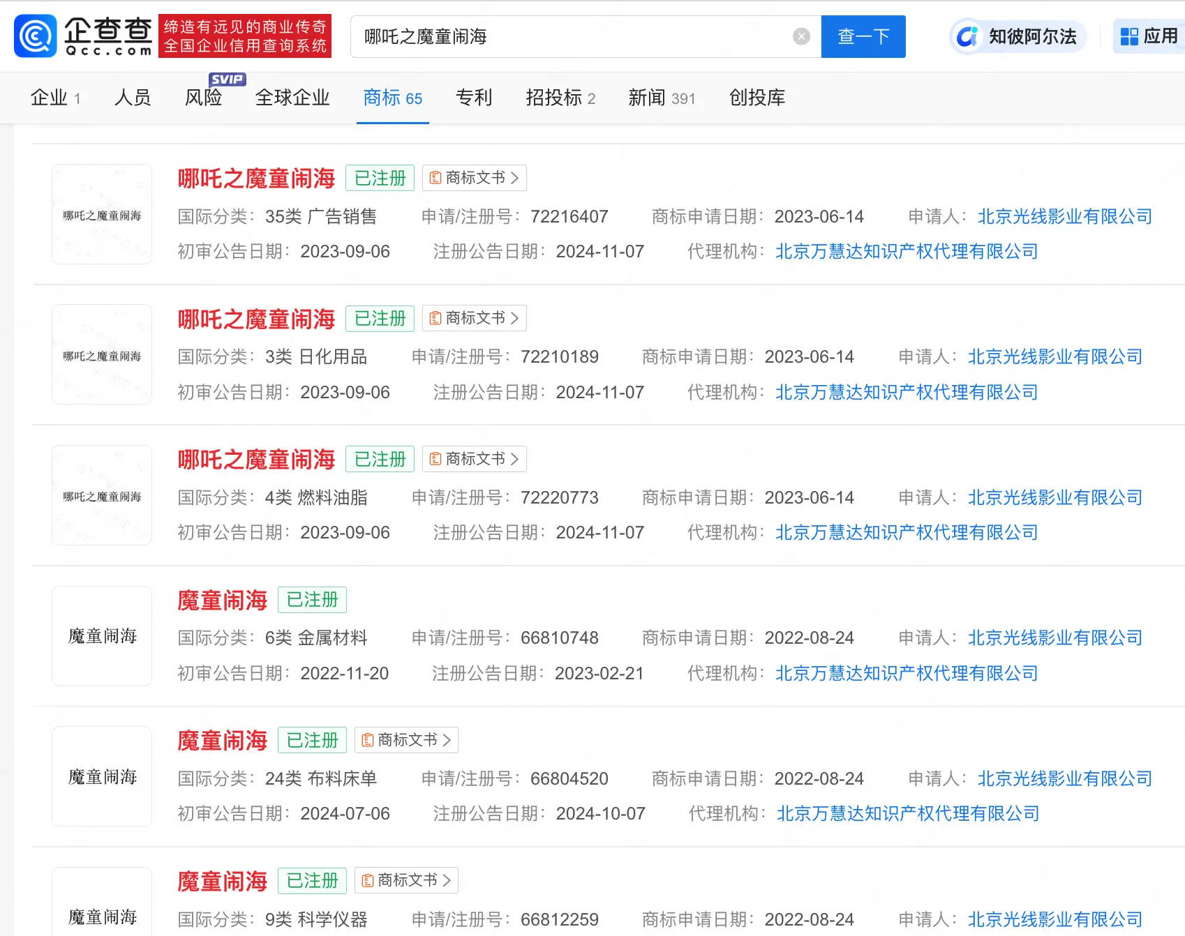 据企查查显示,作为《哪吒2》出品方之一的北京光线影业已成功注册多枚“哪吒之魔童闹海”相关商标,涉及教育娱乐、 广告销售等。