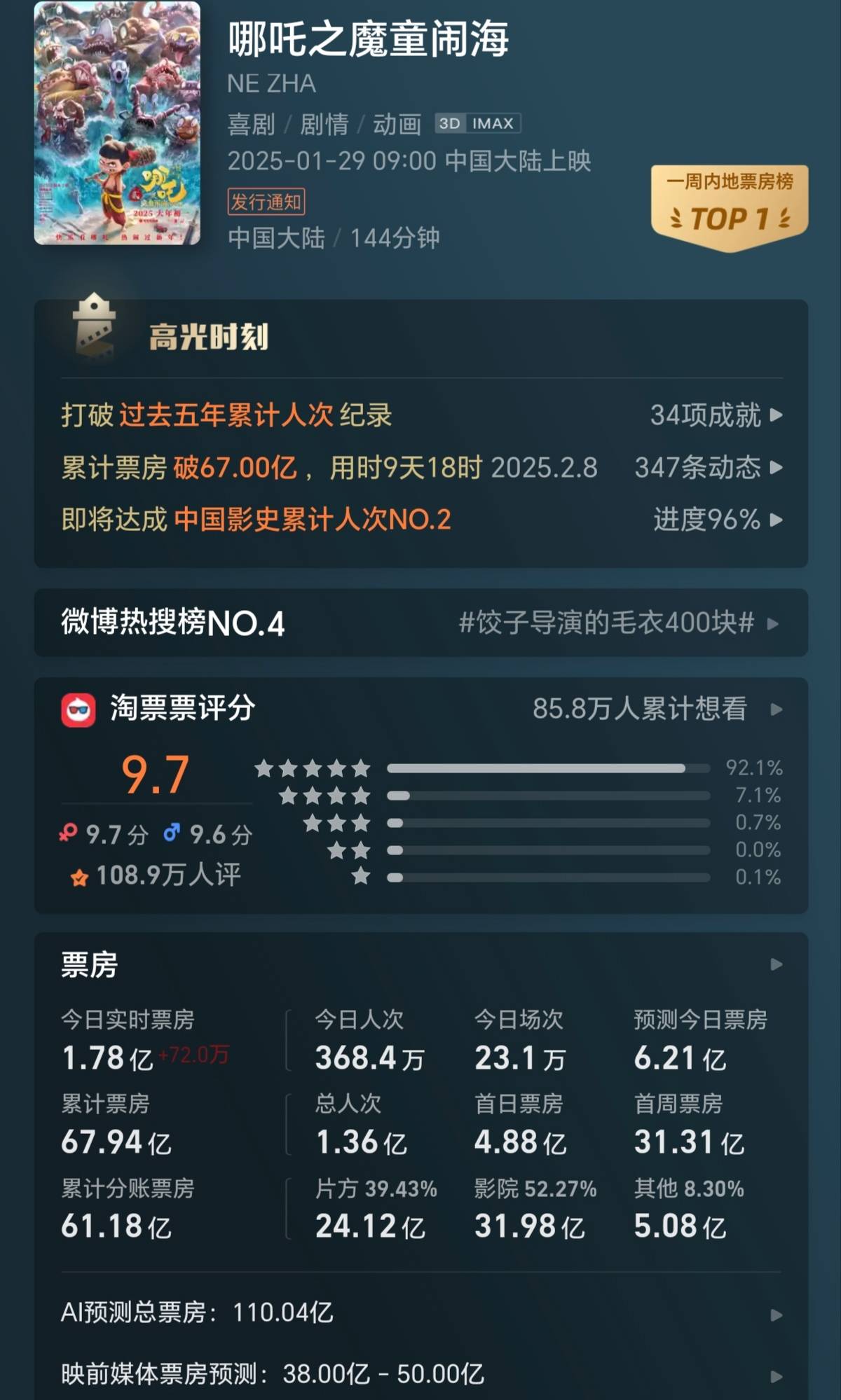 搜狐娱乐讯 (哈麦/文)《哪吒2》爆火,上映10天票房突破了66亿元,猫眼专业版预测其最终总票房将过108亿元,灯塔专业版预测其最终总票房将过110亿元。