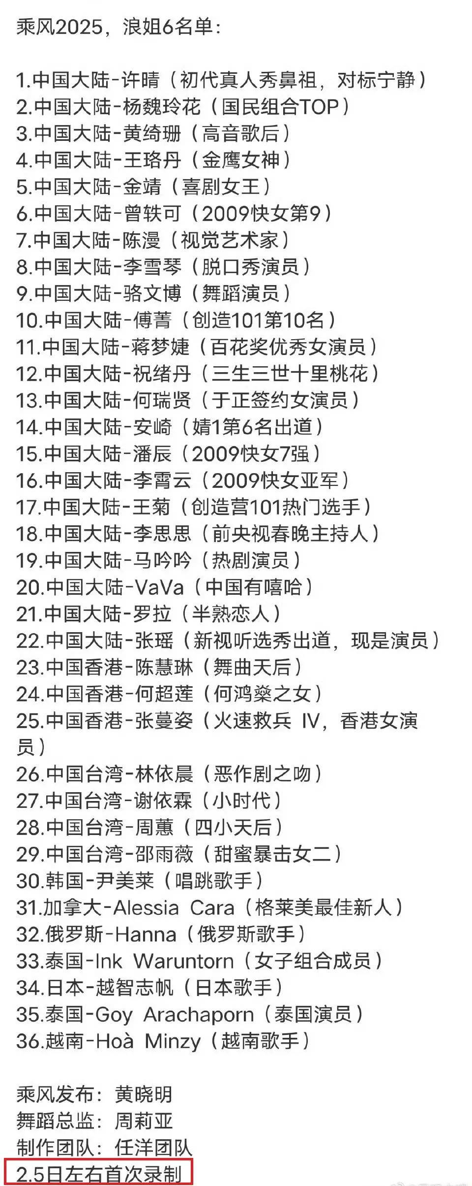 早些时候就有传《浪姐6》准备开录了,还传出了一份有36人的嘉宾名单,乍看之下真实性颇高。