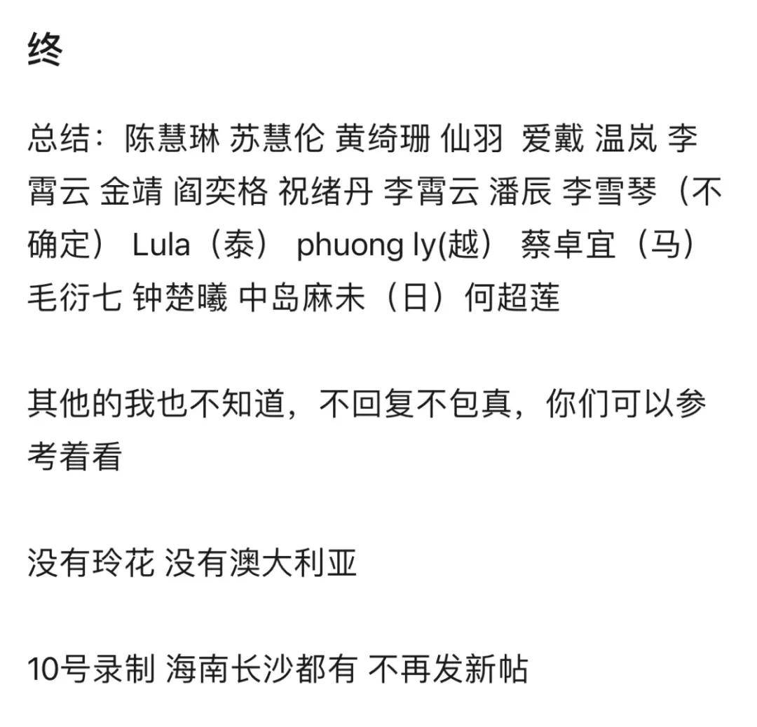名单的最后表示节目会在2月5日左右录制,结合网友的爆料——这几天在海南陵水海边的初舞台已经在搭建了,可见这份名单确实有一定的真实性,但肯定不是百分百真实。