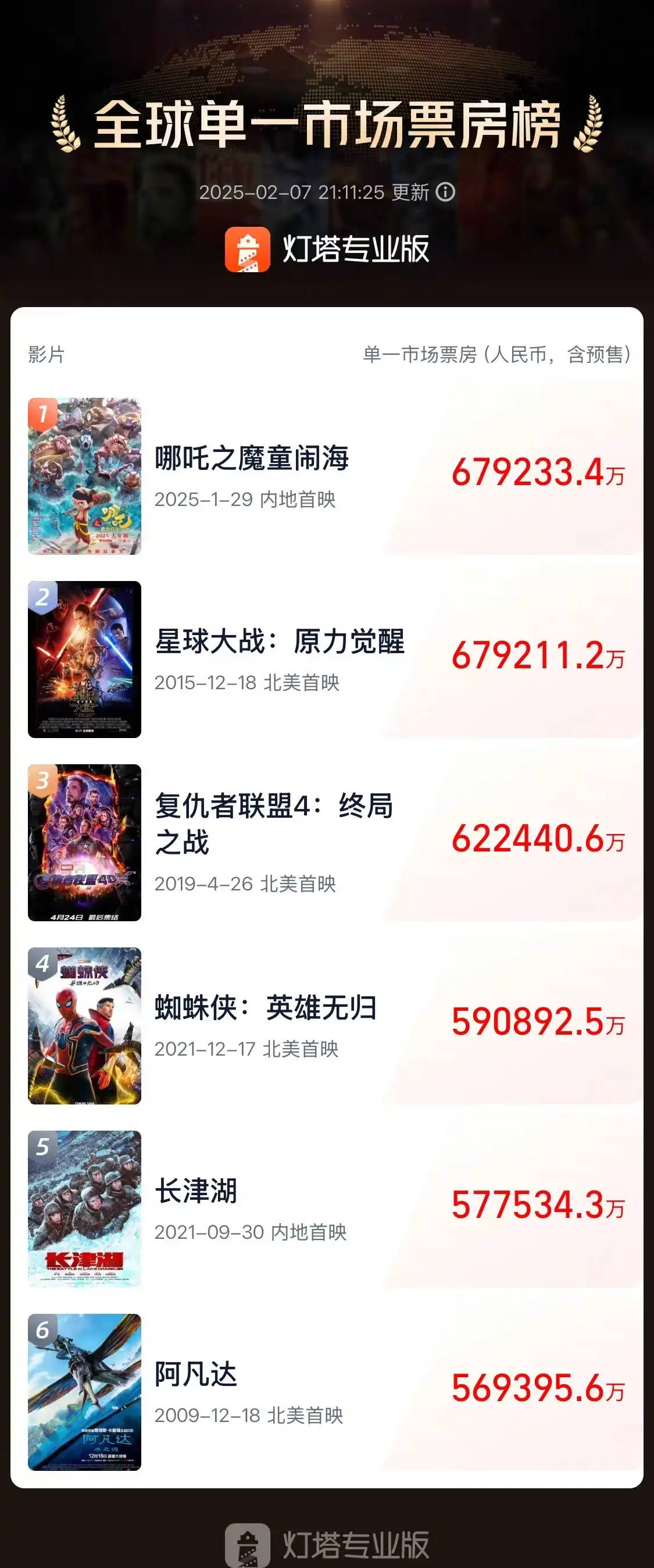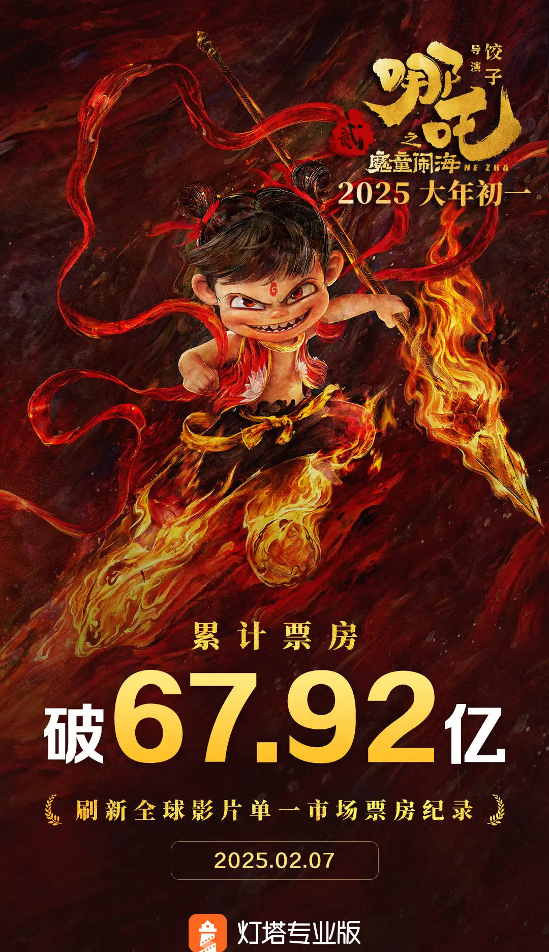 搜狐娱乐讯 据灯塔专业版,《哪吒之魔童闹海》内地单一市场票房(含预售)突破67.92113亿人民币,超过《星球大战:原力觉醒》北美单一市场票房,成为全球影史单一市场票房冠军。