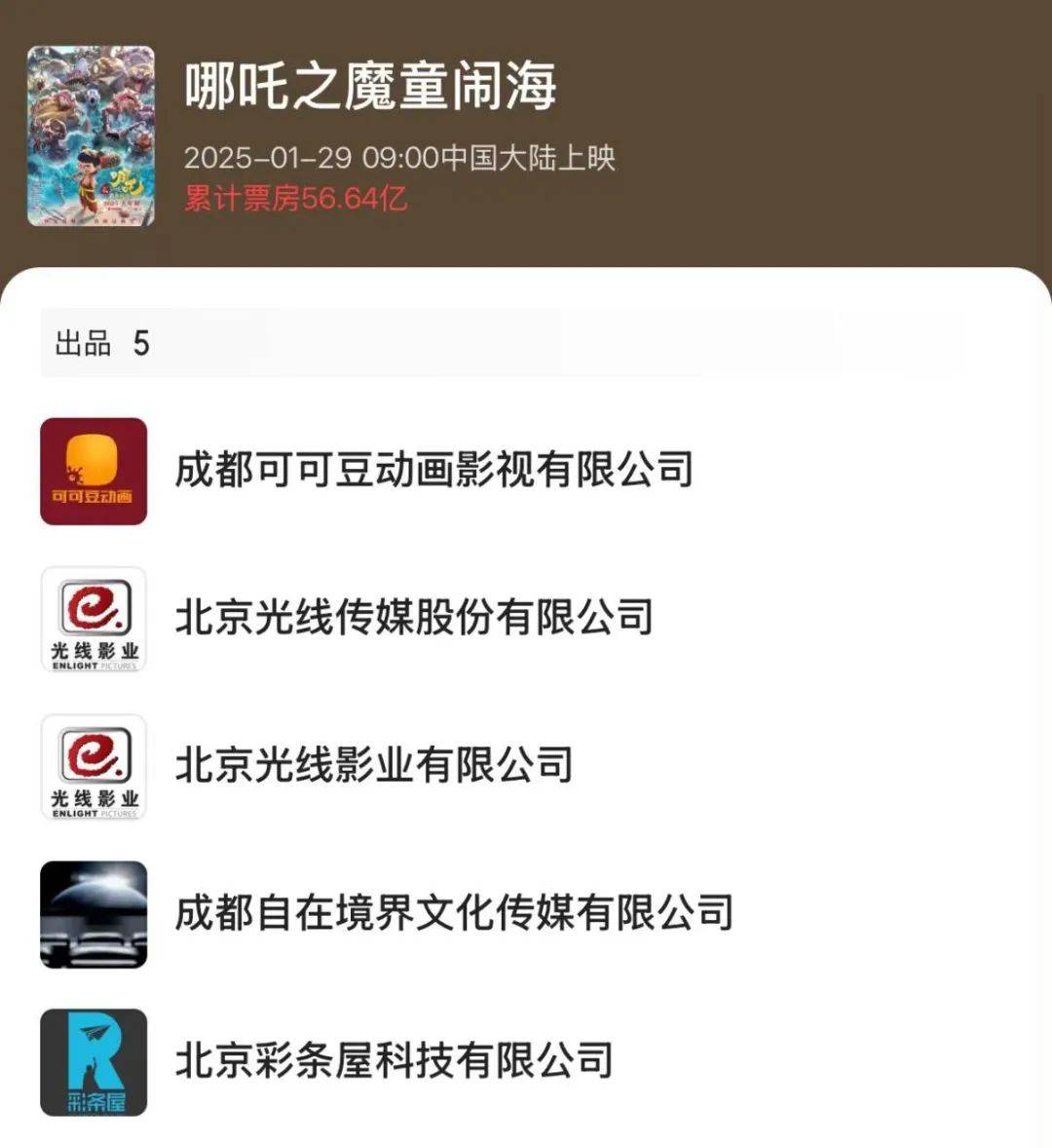 据公开资料,《哪吒2》的主要出品公司有5家,分别是成都可可豆动画影视有限公司、北京光线传媒股份有限公司、北京光线影业有限公司、成都自在境界文化传媒有限公司和北京彩条屋科技有限公司。