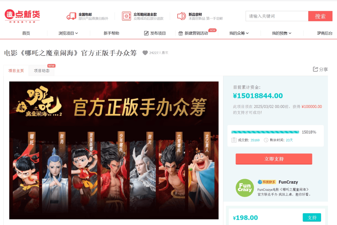 在阿里鱼旗下的造点新货平台,官方周边众筹金额已经突破1500万件。其中,敖光手办单款销量突破万件,包含敖光在内的368元、560元、1938元档第一批众筹火速售罄;连续两日登上淘宝热搜榜,最高冲至TOP2,成为春节档周边市场的“黑马”。