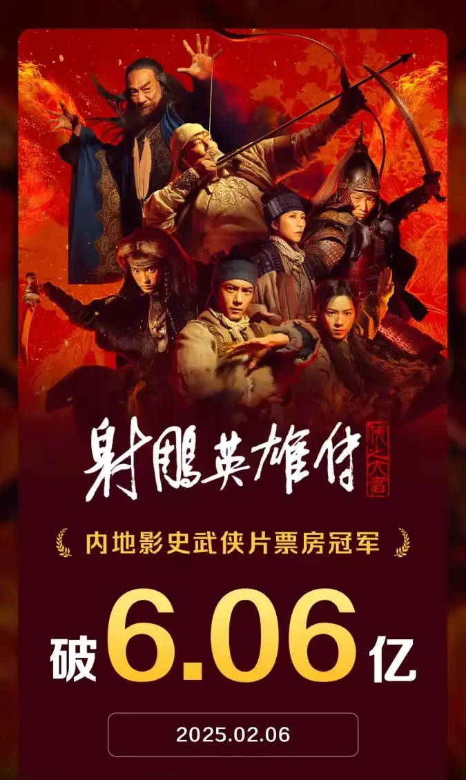 搜狐娱乐讯 2月6日,据灯塔专业版,影片《射雕英雄传:侠之大者》票房突破6.0631亿,超越《狄仁杰之四大天王》,成为内地影史武侠片票房冠军。据悉,这两部电影都由徐克导演,不少网友也因此笑称能超越徐克的只有徐克自己。
