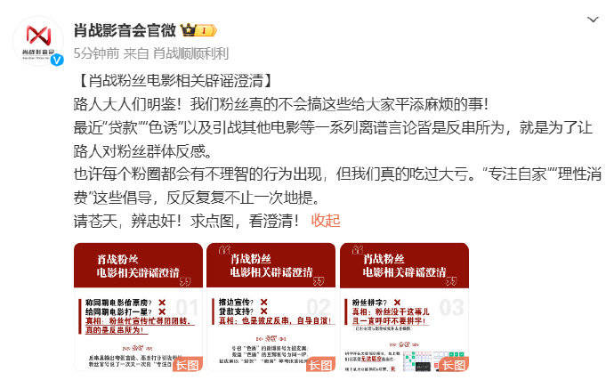 搜狐娱乐讯 2月6日,肖战影音会发文澄清电影《射雕英雄传》相关谣言:最近“贷款”“色诱”以及引战其他电影等一系列离谱言论皆是反串所为,就是为了让路人对粉丝群体反感。
