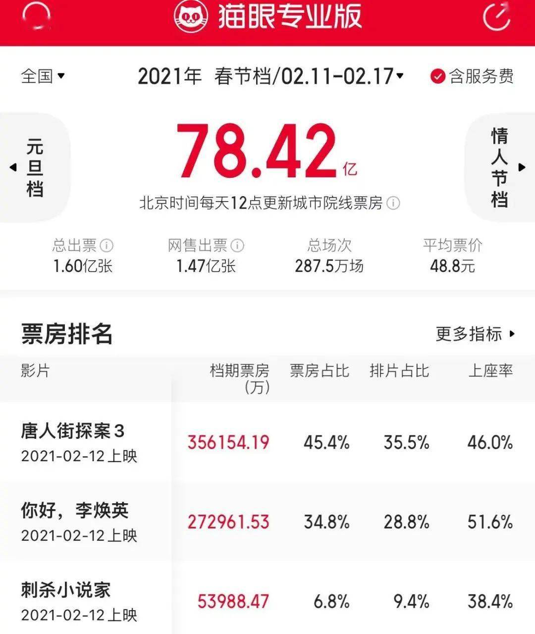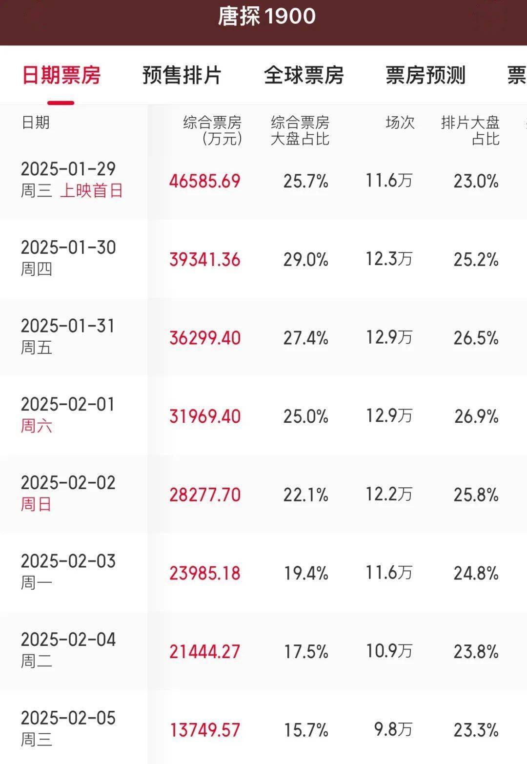 早在上映之前,《唐探1900》已有超过80万人表示“想看”,想看人数高居票务平台榜首。多项映前数据领先同档影片,这也帮助其在春节档开始之际占据排片优势。 上映前两日,《唐探1900》和《哪吒2》的排片不相上下,前者首日65.3%的上座率甚至略高于《哪吒2》(58.1%)。