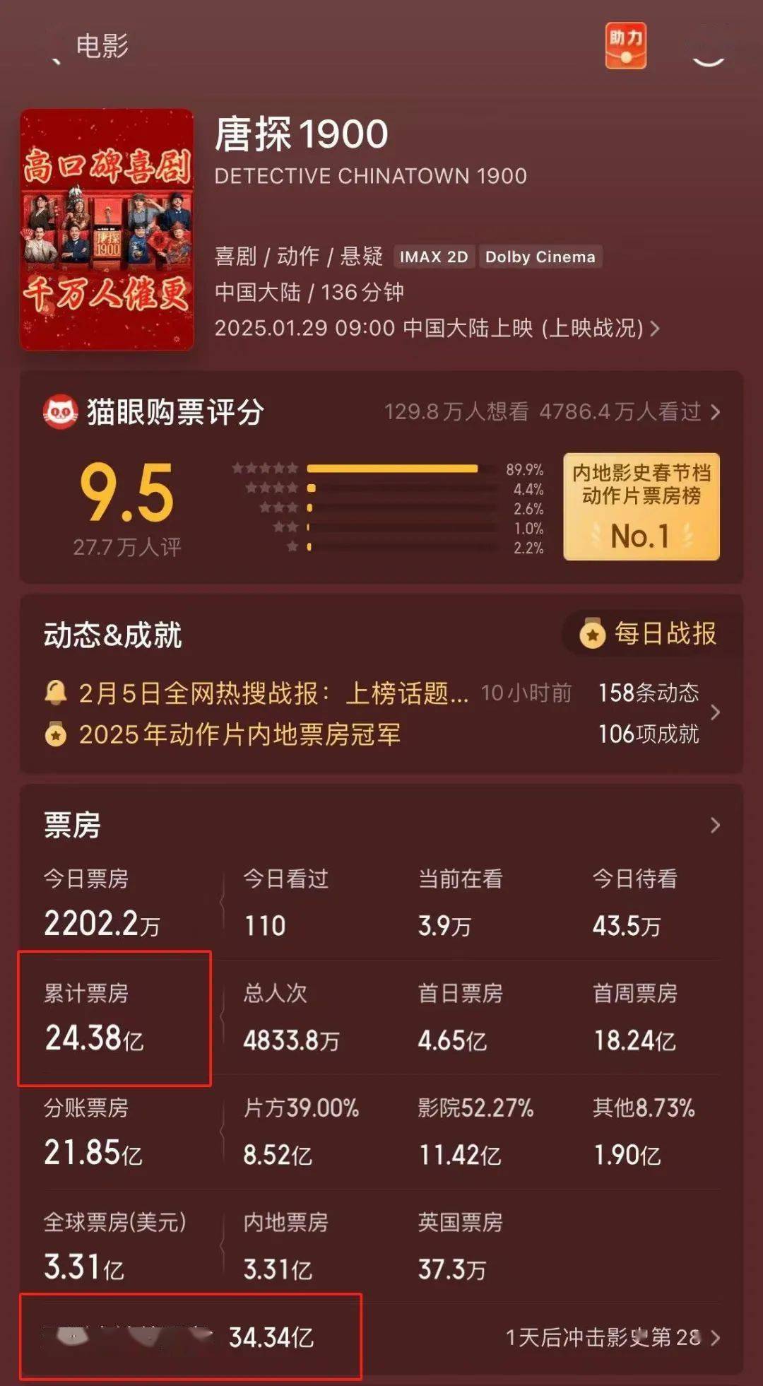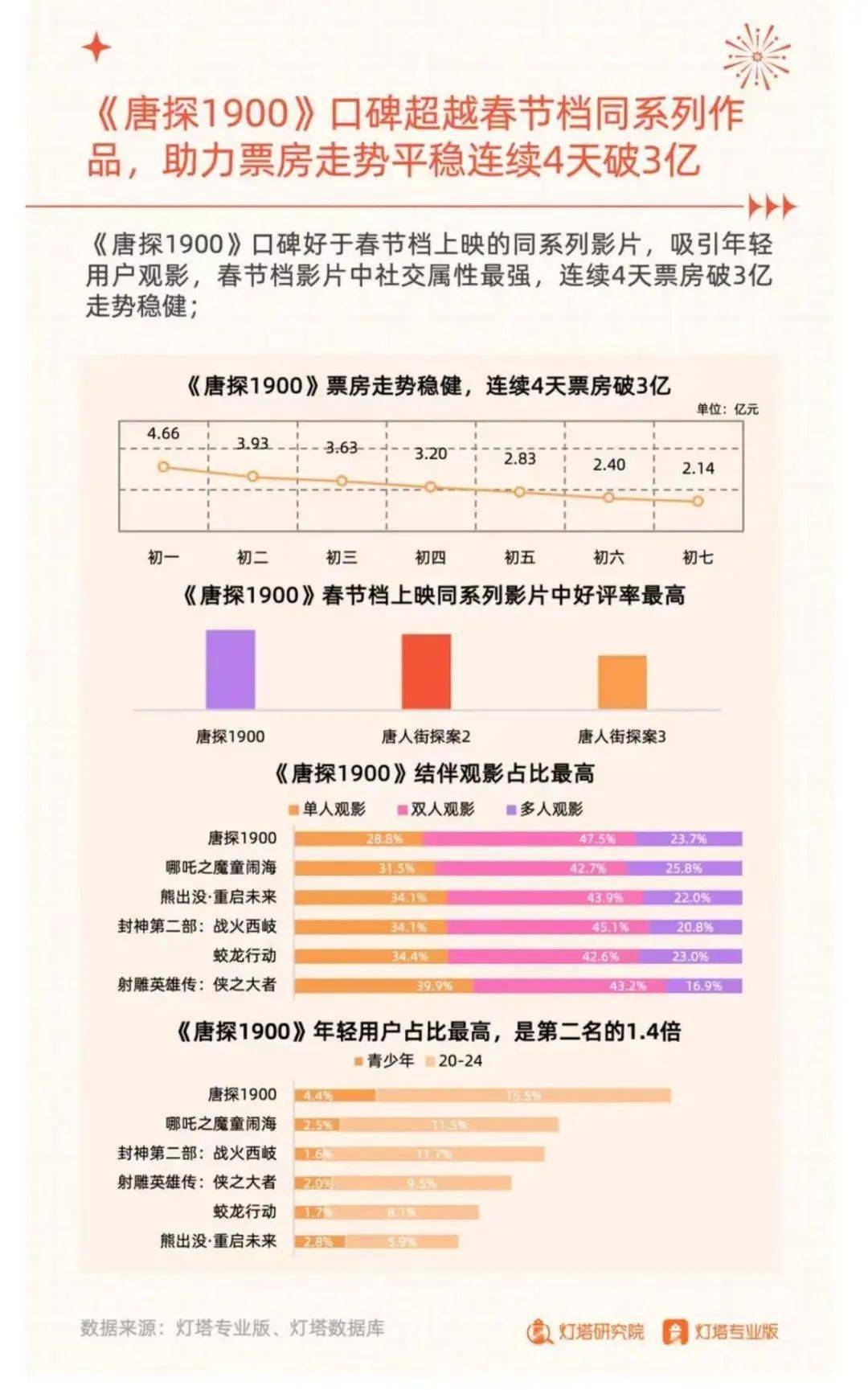 前作留下的辉煌战绩,让大众对《唐探》系列信心满满。《唐探1900》亦全程稳住了排片率和上座率,最终以22.78亿的票房成绩位列春节档第二名,第三次将《唐探》系列推进春节档前二的位置。春节档过后的大年初八,影片单日仍有1.37亿票房进账, 截至发稿,已经连续8天票房破亿。