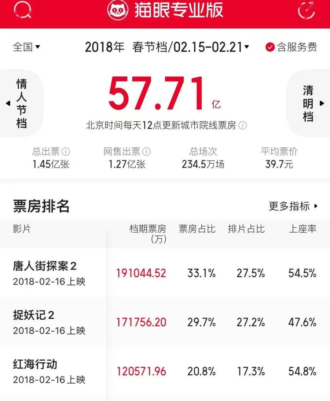 2018年春节档,在《捉妖记2》和《红海行动》“双强”夹击下,影片依然夺得春节档票冠,总票房高达34亿。这一成绩也让《唐探》系列进一步巩固了观众基础。以至于《唐探3》上映时,掀起了现象级的观影狂潮。