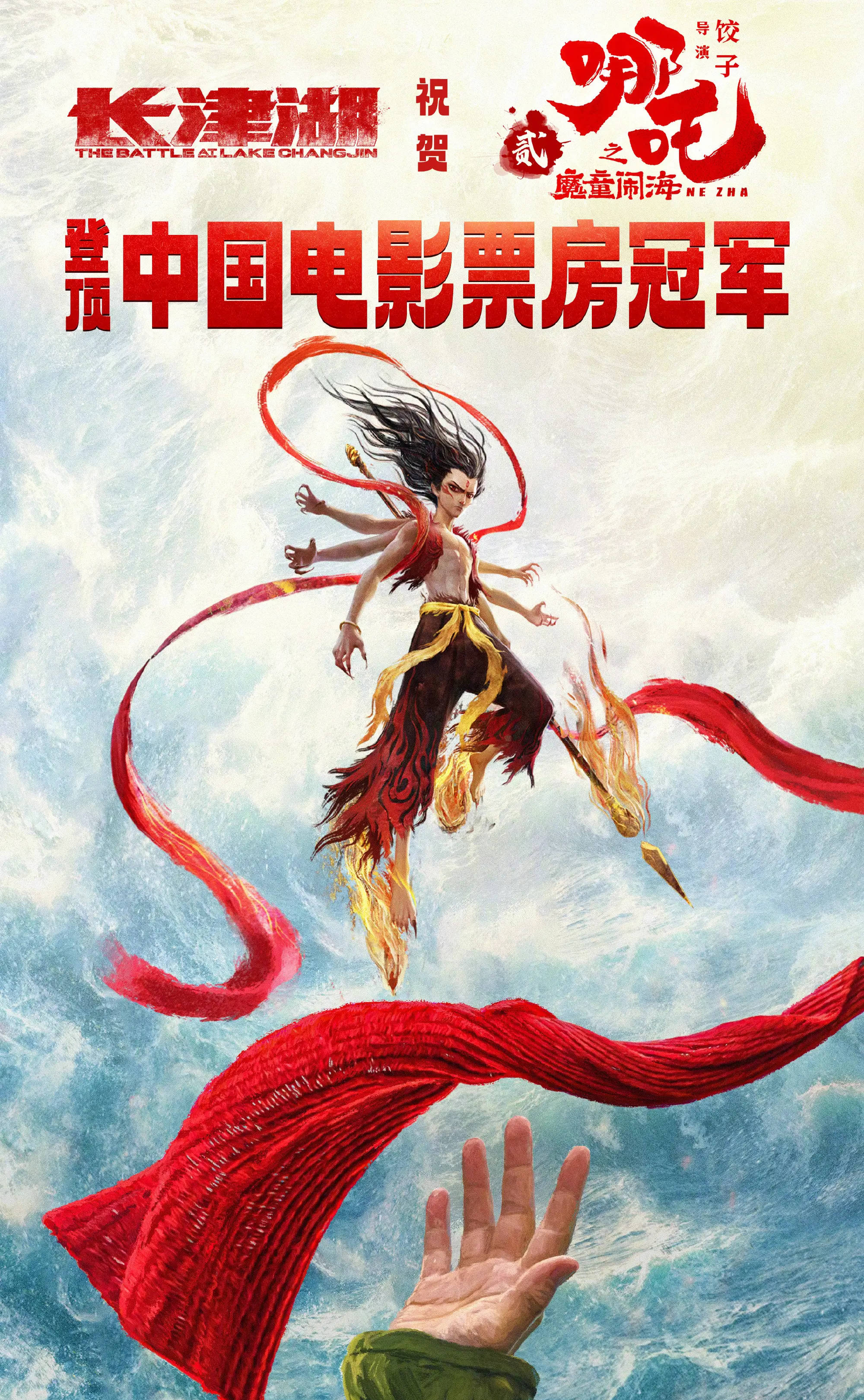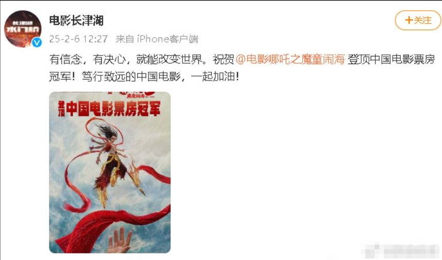 搜狐娱乐讯 2月6日, 《哪吒之魔童闹海》总票房(含点映及预售)超越《长津湖》票房,位列中国电影票房总榜榜首。电影长津湖发布祝贺海报:“有信念,有决心,就能改变世界。”“笃行致远的中国电影,一起加油!”一只手托起哪吒,中国电影一起加油。