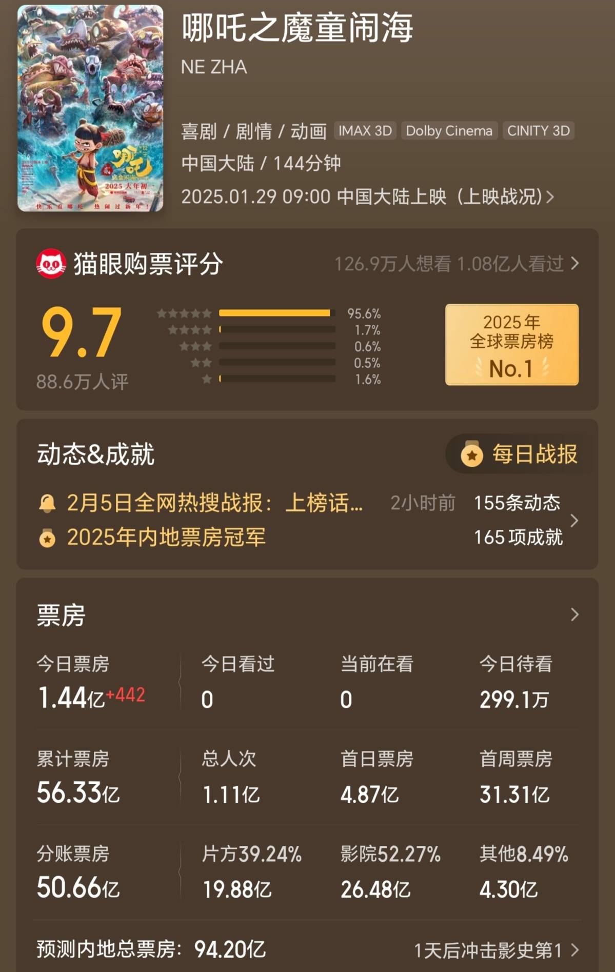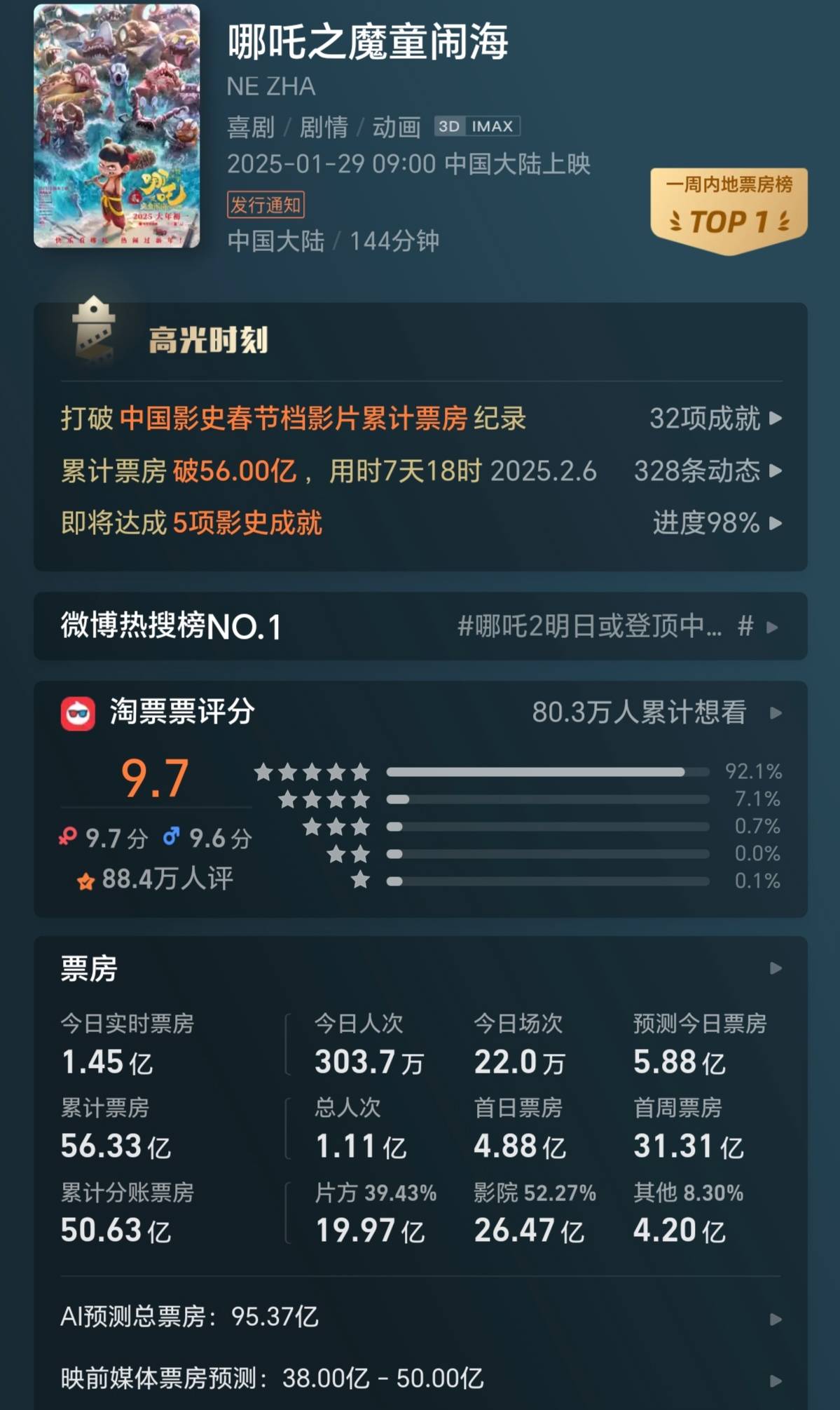 按此走势,猫眼专业版将其最终预测总票房大幅调高到了94亿元以上,灯塔专业版将其最终预测总票房大幅调高到了95亿元以上。