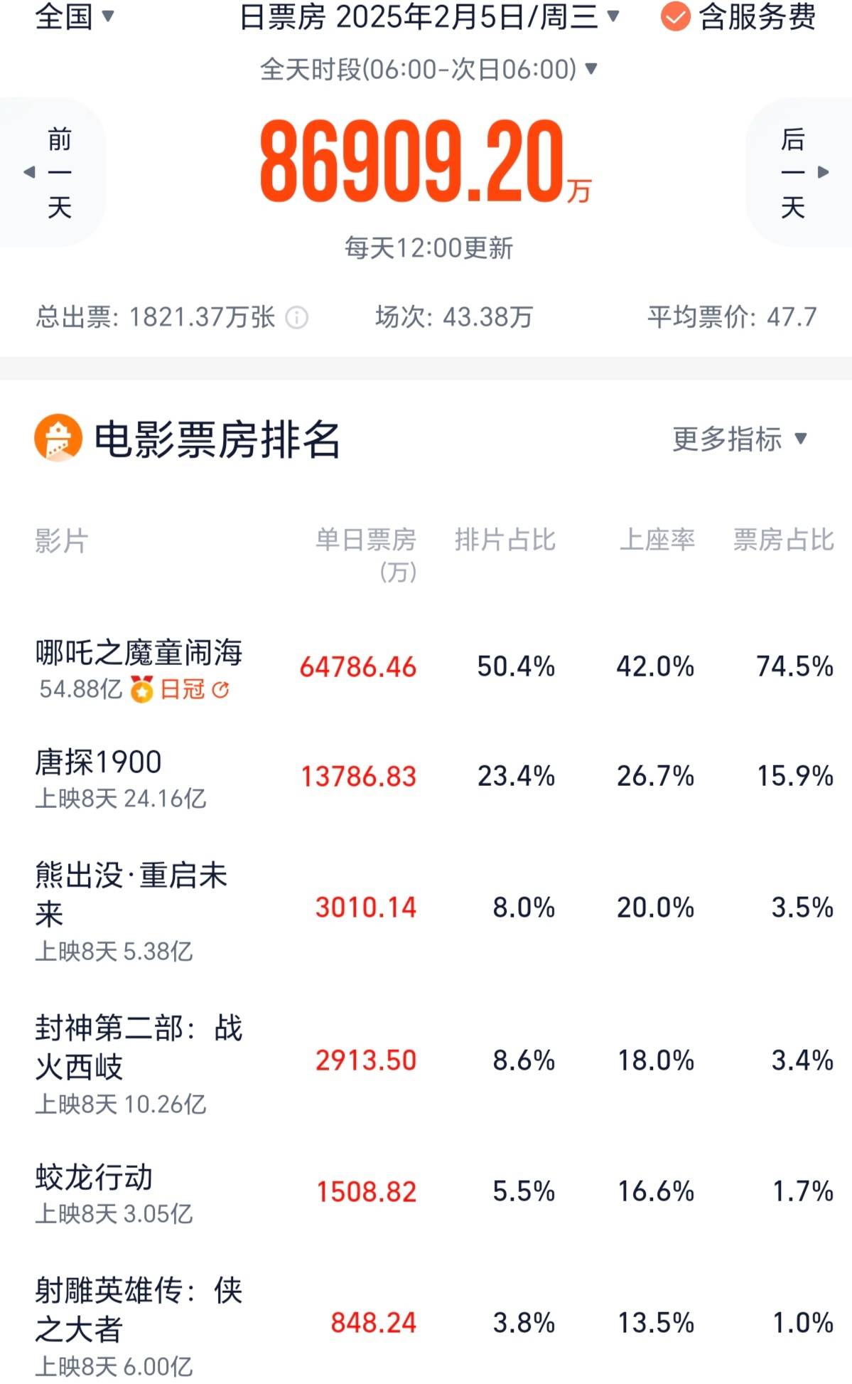 《哪吒之魔童闹海》依然火爆,初八日票房6.48亿元,较初七下跌25%,占了大盘票房的近75%。