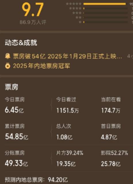 2月5日,根据猫眼专业版和灯塔专业版的最新AI推算,国漫经典《哪吒之魔童闹海》的最终票房预测已上调至94亿人民币,折合近13亿美元!这部影片在观众心中的热度持续攀升,截至2月5日19时11分,影片《哪吒之魔童闹海》票房突破54.14亿,超过《你好,李焕英》进入中国影史票房榜前三,同时成为中国影史春节档影片票房冠军!