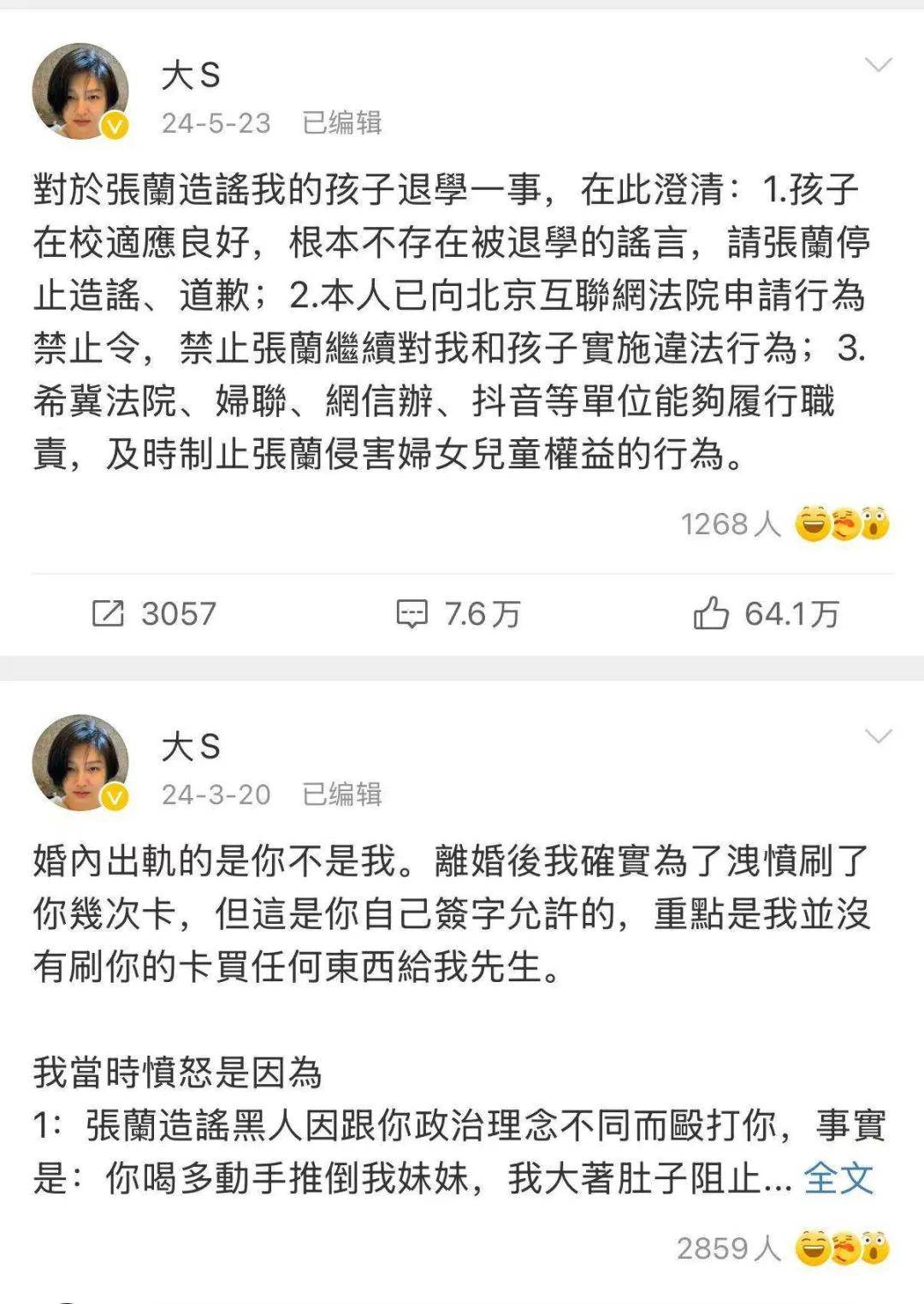 所有人目光、骂声中,麻六记日渐红红火火,2024年,大S在微博发文:“十年婚姻,2死1重伤。”其中,两死是指自己流产的孩子,她公布了自己流产的时间线里,2018年,参加《幸福三重奏》的她流产才刚刚7天。