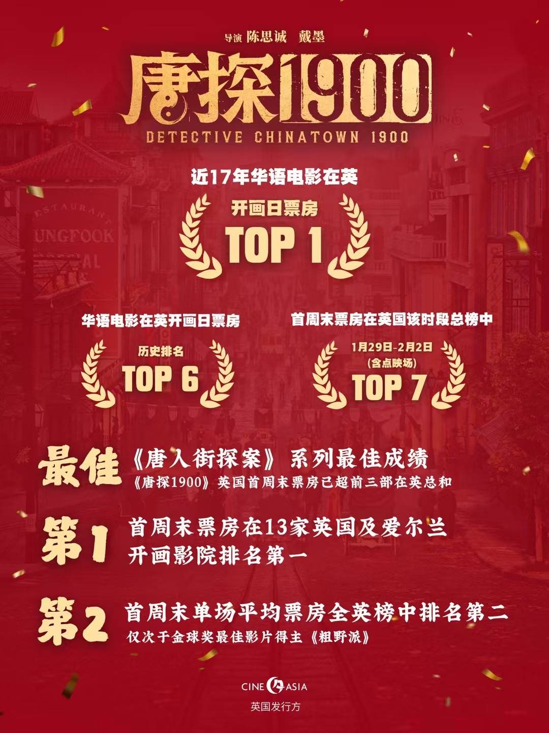 据悉,目前《唐探1900》在英国票房已打破多项记录,其累计票房超同期在英上映春节档华语电影2倍以上,首周末票房跻身英国及爱尔兰票房前10,首周末单场平均票房全英该周末排名第二,仅次于金球奖最佳影片得主《粗野派》,并创下近17年华语电影在英开画日票房最高记录,历史排名第七。截至发稿,《唐探1900》已取得《唐人街探案》系列在英最佳成绩,其英国首周末票房已超前三部在英总和。