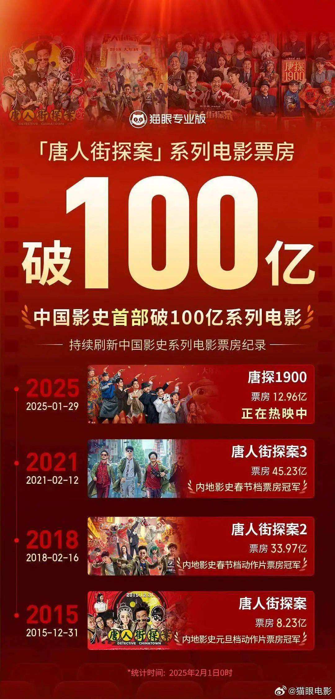 截至2025年2月1日0时,《唐探1900》票房达到12.97亿,唐人街探案系列电影以《唐人街探案1》的8.22亿、《唐人街探案2》的33.97亿、《唐人街探案3》的45.23亿成为中国影史首部票房破100亿的系列电影。