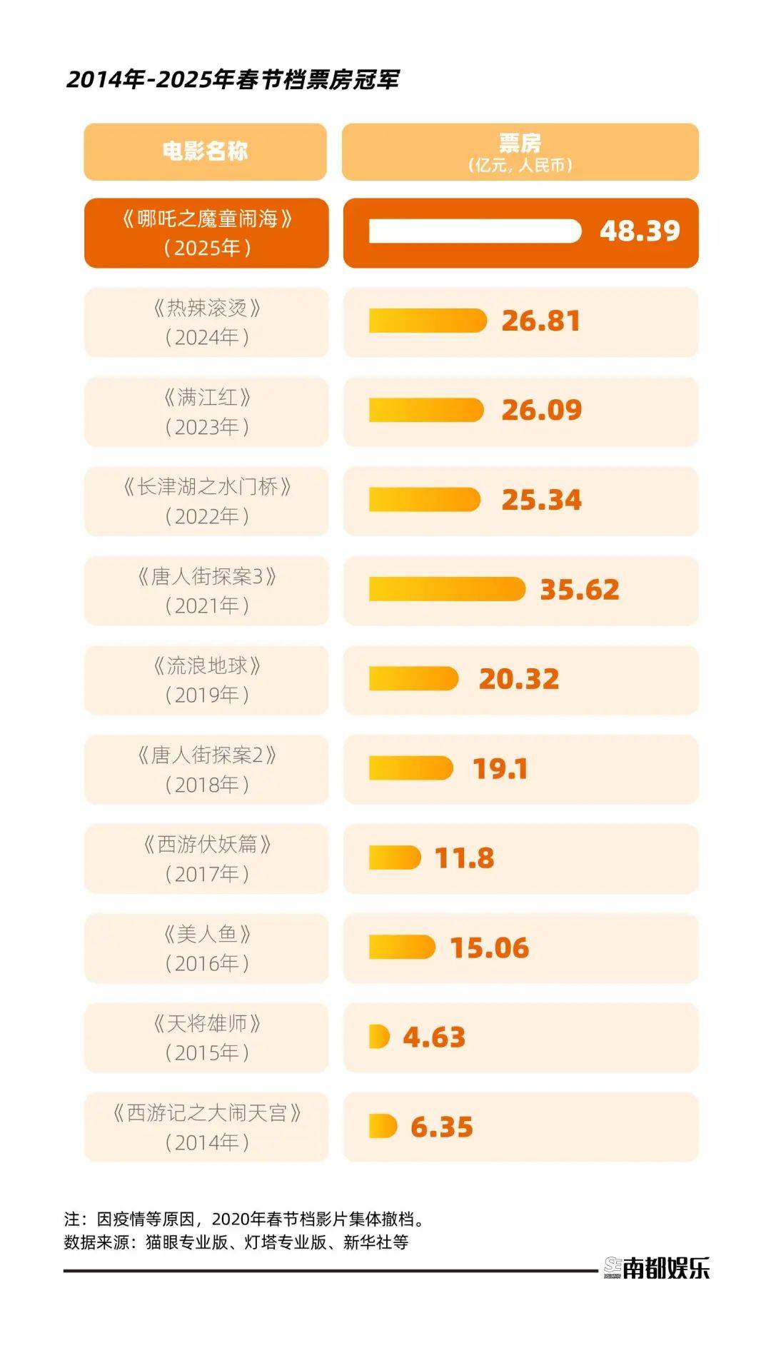 《哪吒之魔童闹海》以48.39亿元领跑档期票房,跻身影史票房榜前五的同时,也成为成绩最好的春节档票房冠军,比2021年《唐人街探案3》多了近13亿元。