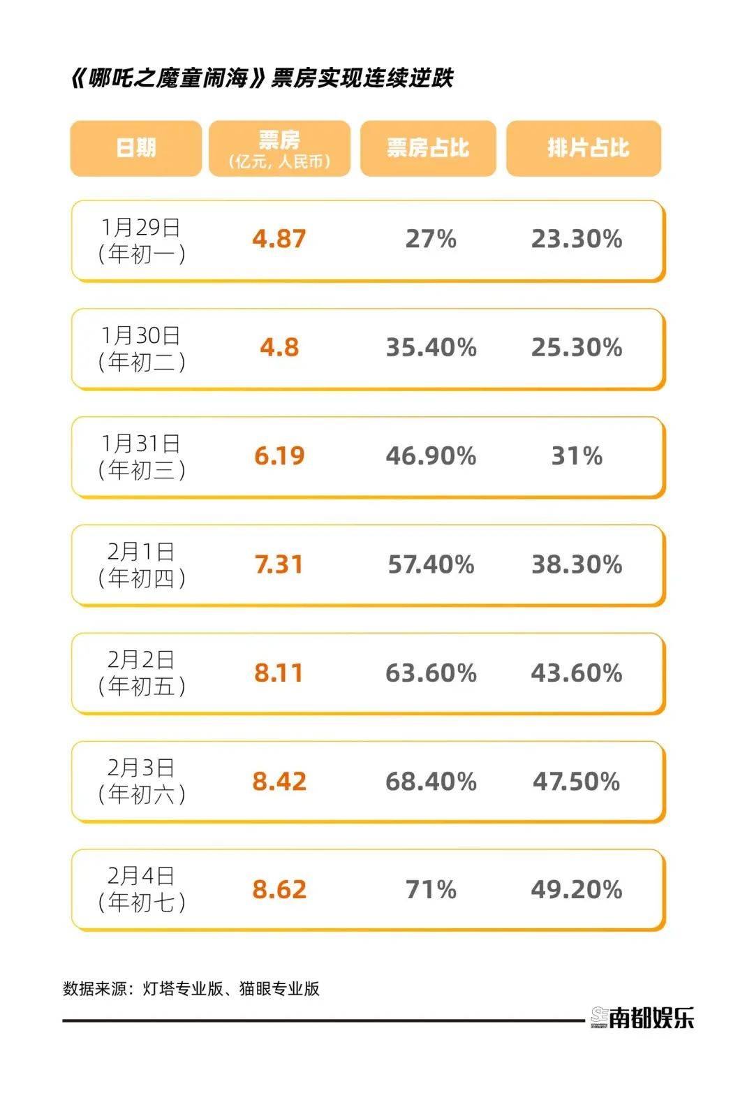 大年初四,《哪吒之魔童闹海》的排片占比提升到38.3%,单日票房也首次突破7亿元,所占比例更突破50%。