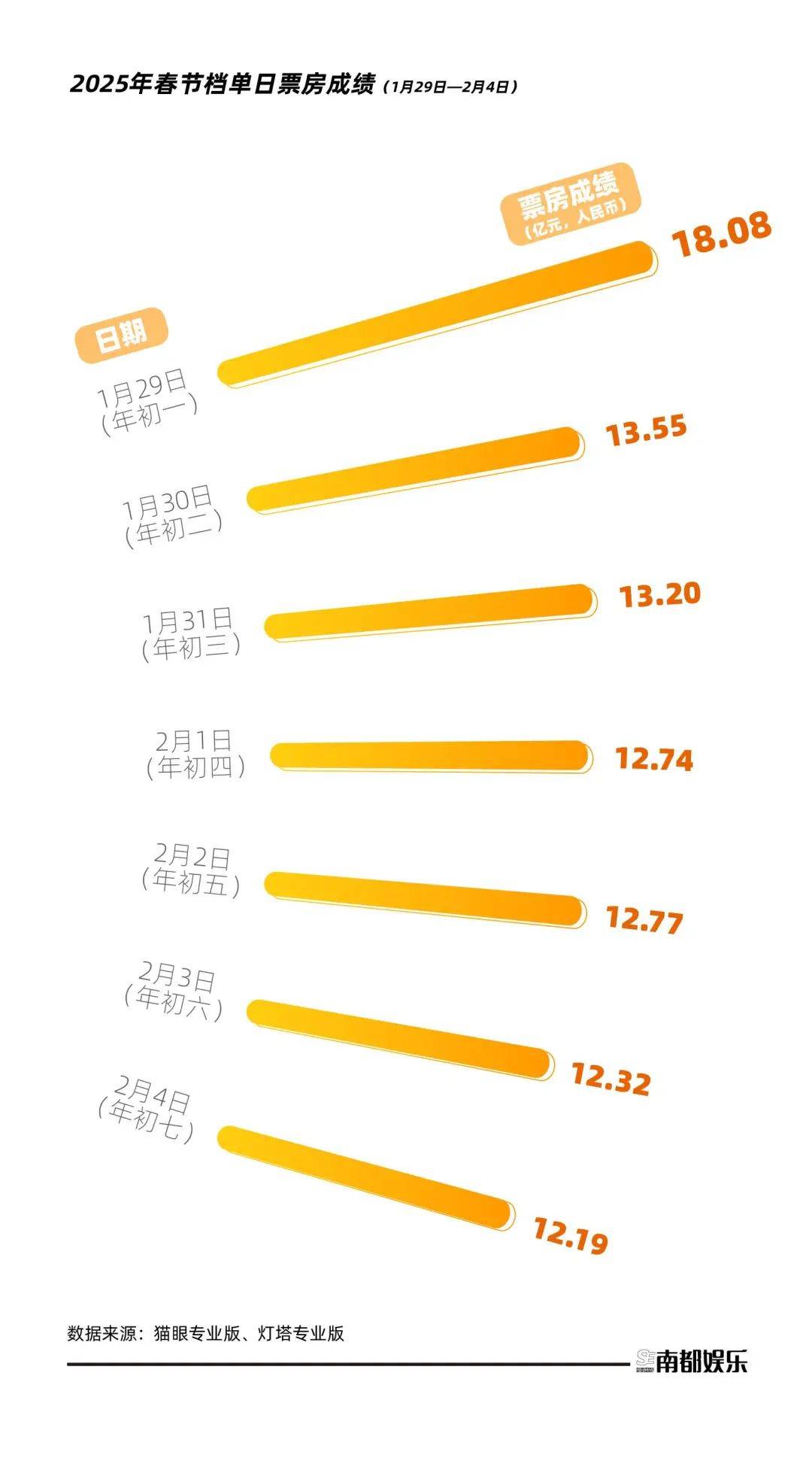 但得益于《哪吒之魔童闹海》等片子的强势表现和高票房号召力,年初四到年初七也保持了12亿元以上的票房基本盘。