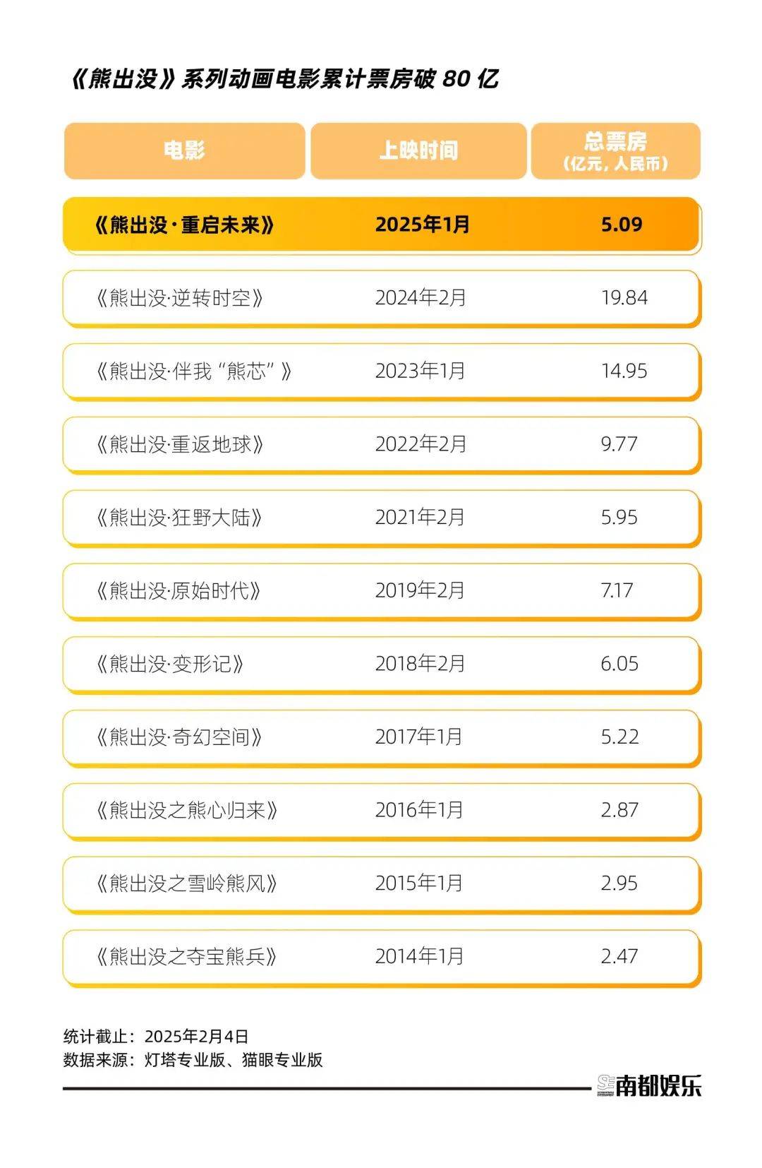 目前,在今年春节档热映的《熊出没:重启未来》票房也已突破5亿元。