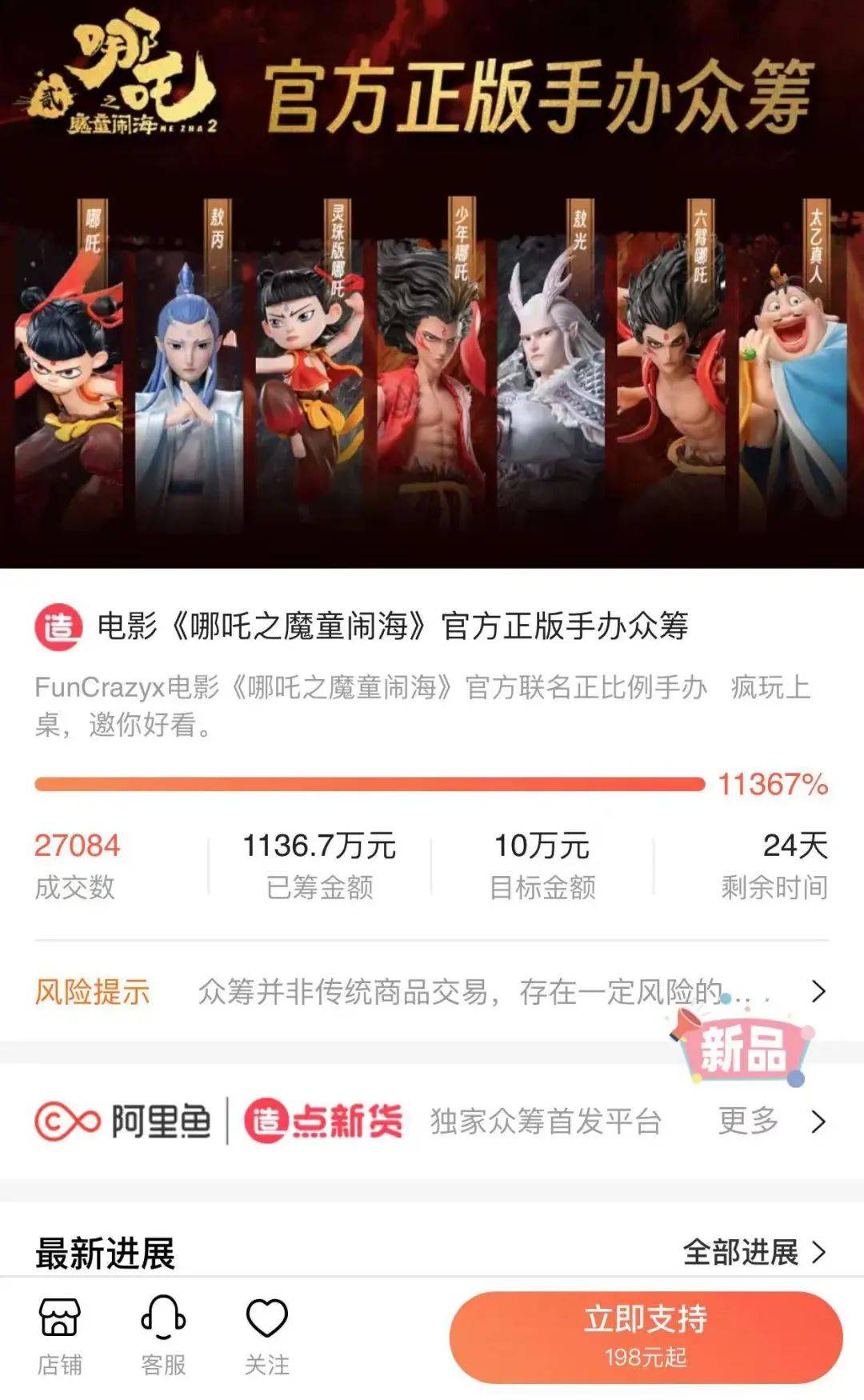 除了盲盒产品,《哪吒之魔童闹海》还在淘宝的阿里鱼平台与国内模型制造厂商合作,众筹推出多款电影的角色手办。