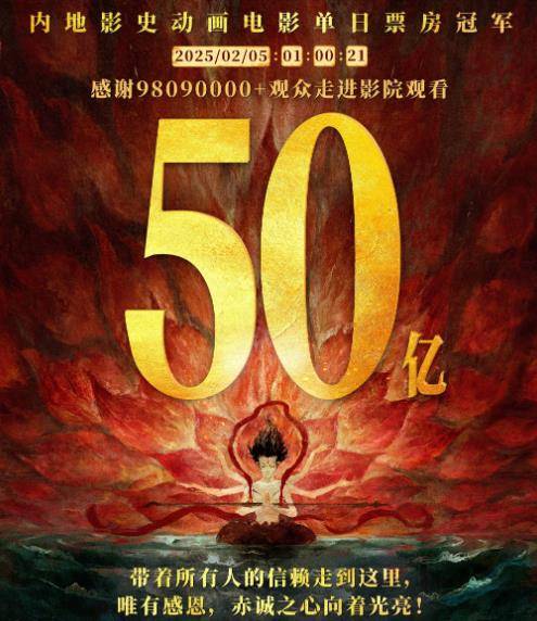 2月5日1时,《哪吒之魔童闹海》票房突破50亿元。目前中国影史动画片票房纪录保持者是《哪吒之魔童降世》的50.35亿元。