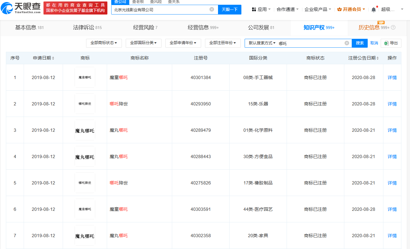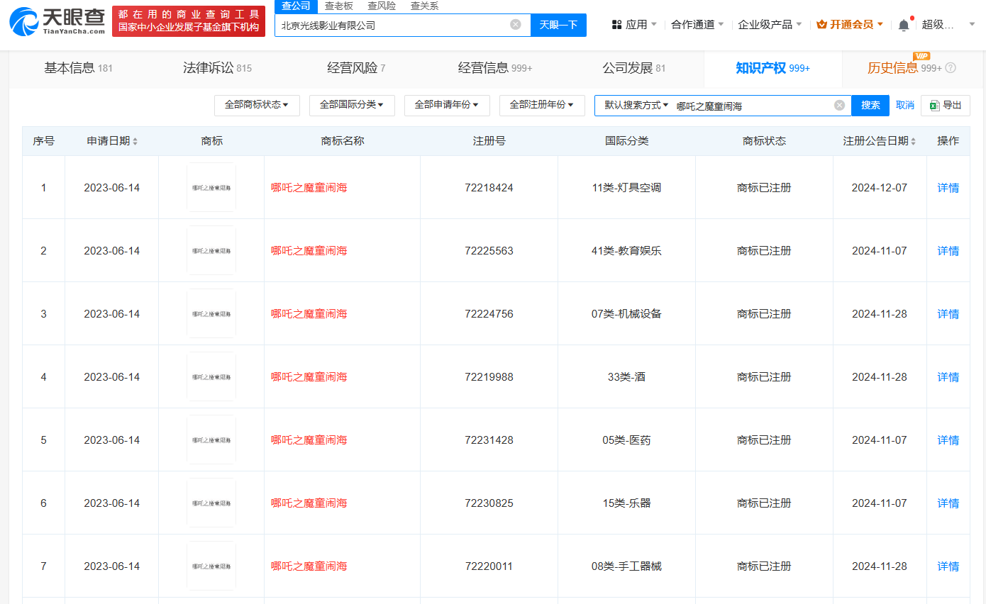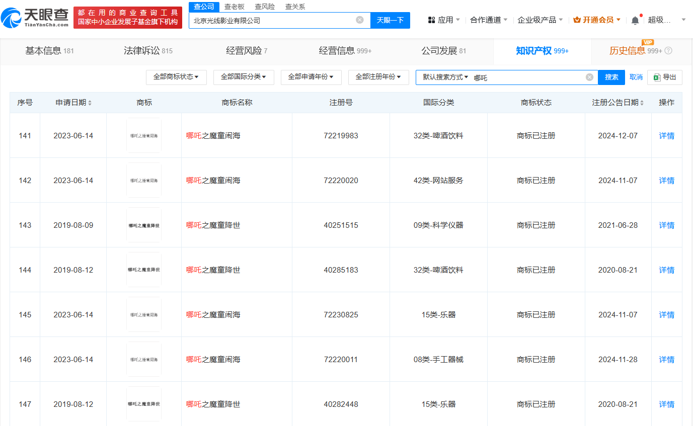 天眼查知识产权信息显示,光线传媒(300251)旗下北京光线影业有限公司已成功注册多枚“哪吒之魔童闹海”商标,国际分类涉及教育娱乐、餐饮住宿、广告销售等。此外,该公司还注册了多枚“魔童哪吒”“哪吒降世”“魔丸哪吒”“哪吒之魔童降世”商标。