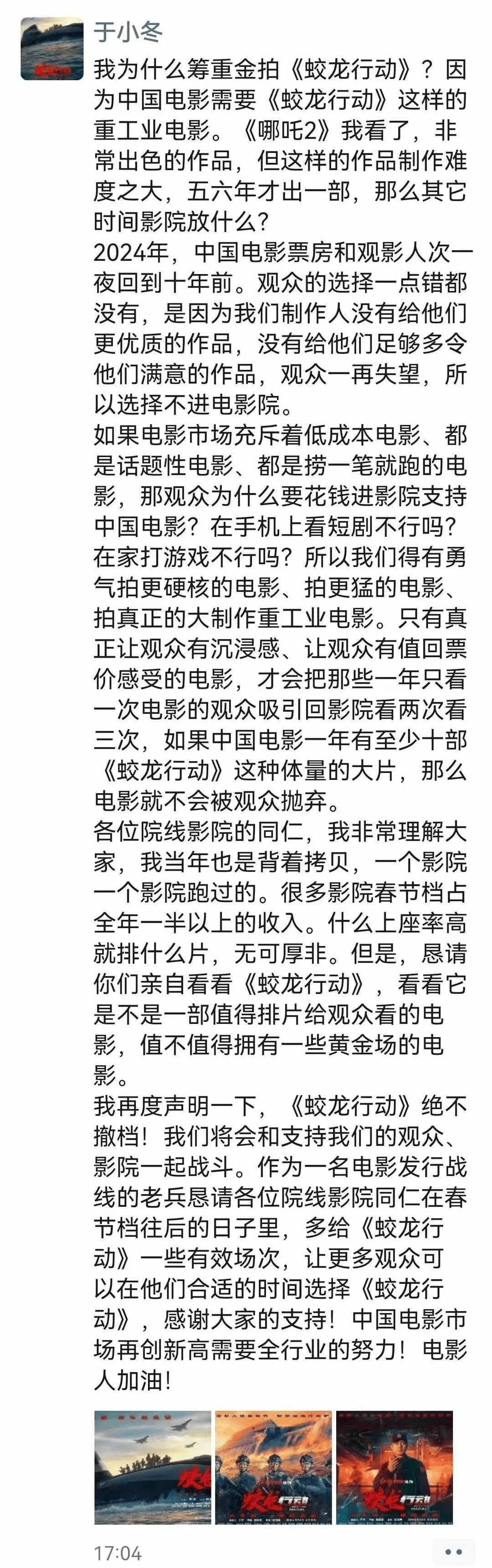 日前,博纳影业总裁发长文谈为什么要拍重工业电影,同时恳请院线能给春节档上映的《蛟龙行动》一些黄金场次,声明《蛟龙行动》绝不撤档。