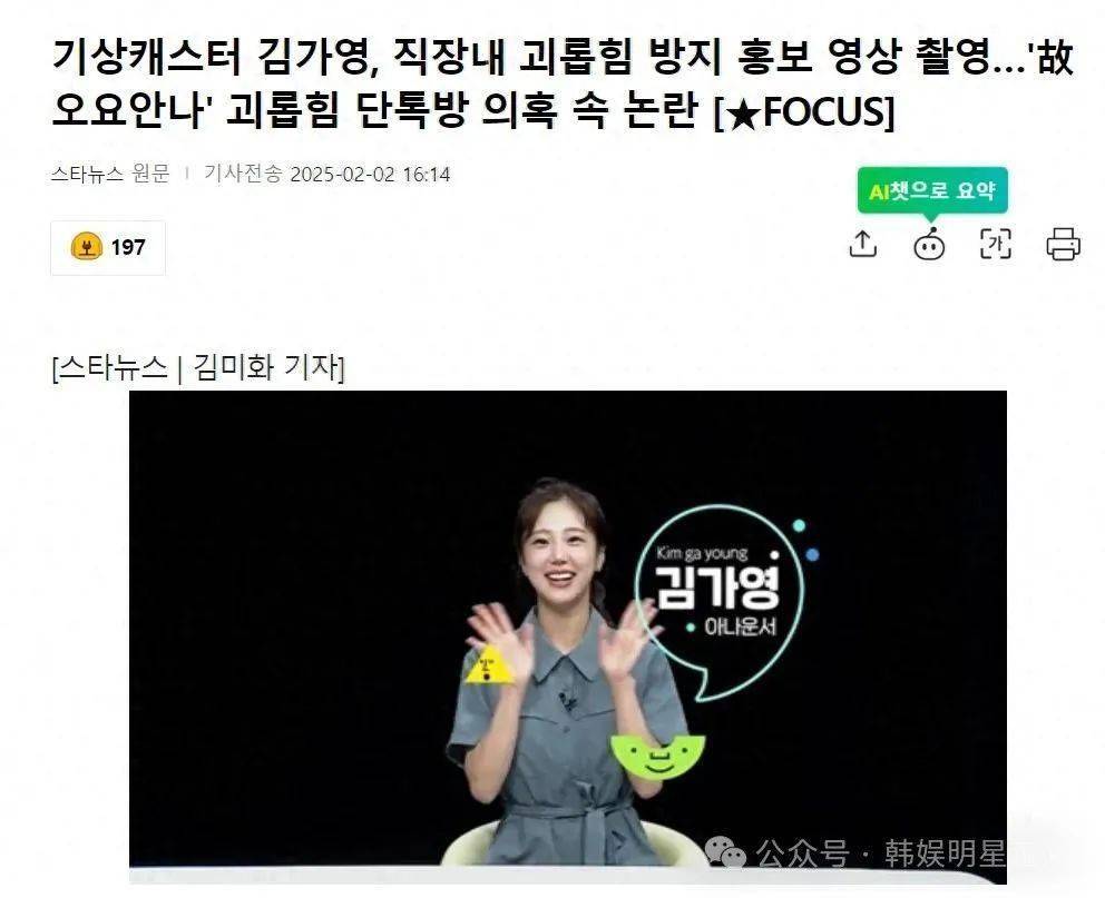 大家好呀,这里是你们的小娱~今天咱们来聊聊MBC气象主播金佳英的最新动态!据韩国媒体2月2日报道,金佳英拍摄了一部职场欺凌预防宣传视频,结果却引发了轩然大波!宝子们,这瓜真的是越吃越大了!