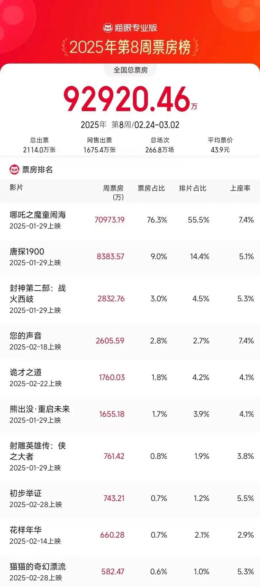 上周进入春节档后第三周,随着《哪吒之魔童闹海》票房下滑明显,大盘整体热度也继续腰斩。据猫眼专业版数据,02.24-03.02内地一周票房报收9.29亿,较前一周的20.48亿下跌54.6%。