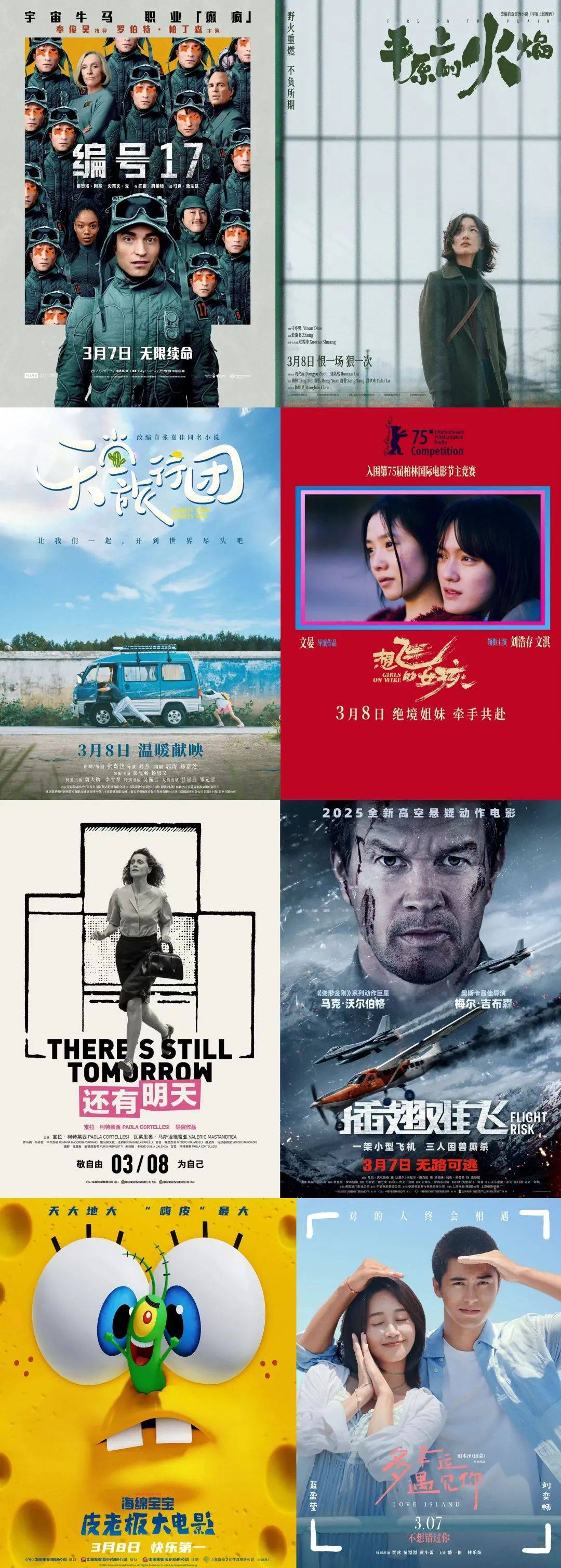八部新片分别是——奉俊昊执导的好莱坞科幻片《编号17》,周冬雨和刘昊然主演的积压犯罪电影《平原上的火焰》,刘浩存和文淇主演的柏林主竞赛入围电影《想飞的女孩》,彭昱畅主演的张嘉佳小说改编电影《天堂旅行团》,现象级意大利女性电影《还有明天》,好莱坞空中动作片《插翅难飞》,动画片《海绵宝宝:皮老板大电影》,以及国产爱情片《多幸运遇见你》。