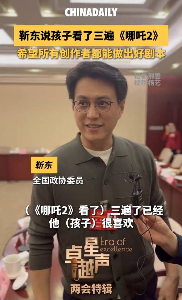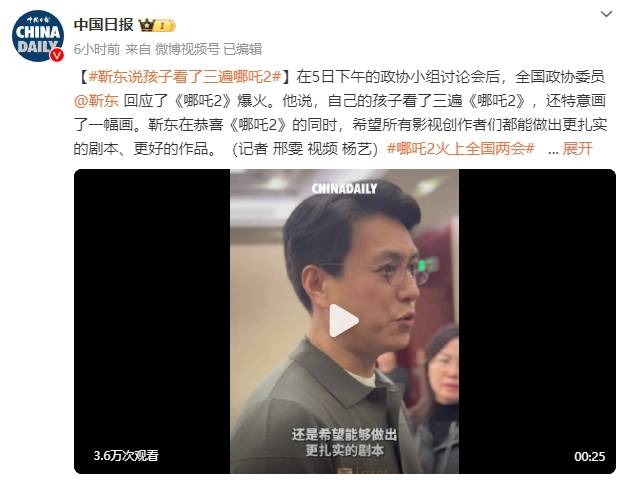 在5日下午的政协小组讨论会后,全国政协委员靳东回应了《哪吒2》爆火。他说,自己的孩子看了三遍《哪吒2》,还特意画了一幅画。靳东在恭喜《哪吒2》的同时,希望所有影视创作者们都能做出更扎实的剧本、更好的作品。
