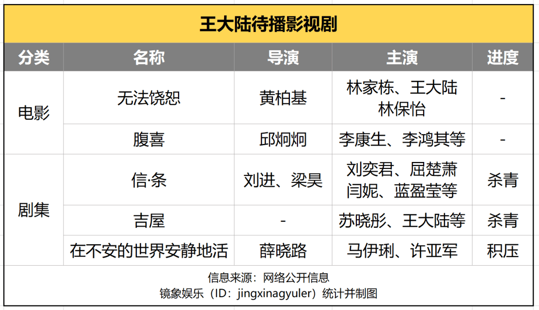 其中,剧集《信·条》阵容不俗,导演之一的刘进曾执导《白鹿原》《悬崖》等热门剧集,目前该剧已经杀青。此外,还有由薛晓路执导剧集《在不安的世界安静地活》、港片《无法饶恕》等项目也颇受期待。但如今,王大陆涉案风波频频,个人发展的转机转瞬即逝,原本已走上“下坡路”的演艺生涯,如今更是雪上加霜了。