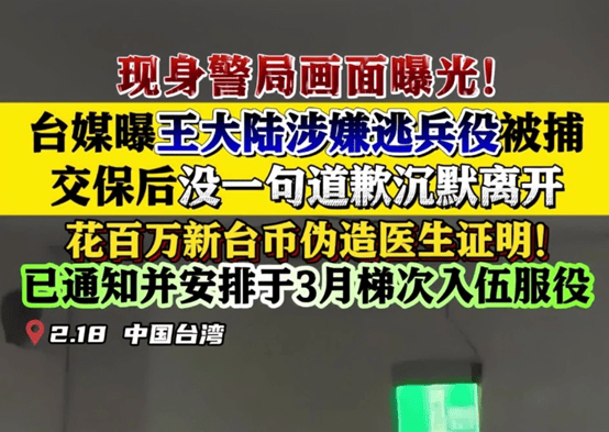 据南方都市报消息称,在王大陆涉嫌逃兵役事件被曝光之前,台湾有关部门接获线报称,有专门替试图逃兵役者伪造病历证明的犯罪集团,且已协助多人免服兵役。2月18日,“新北地检署”根据该线报,指挥警方执行搜索,并带回十余名涉案人员,其中便包括演员王大陆。